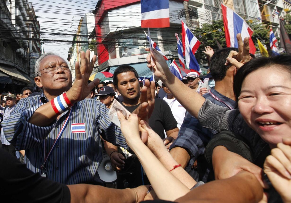 | Cựu thủ tướng Suthep nhận tiền quyên góp của người biểu tình khi ông tuần hành cùng đám đông tại thành phố Bangkok hôm 20/12. Ảnh: Reuters |