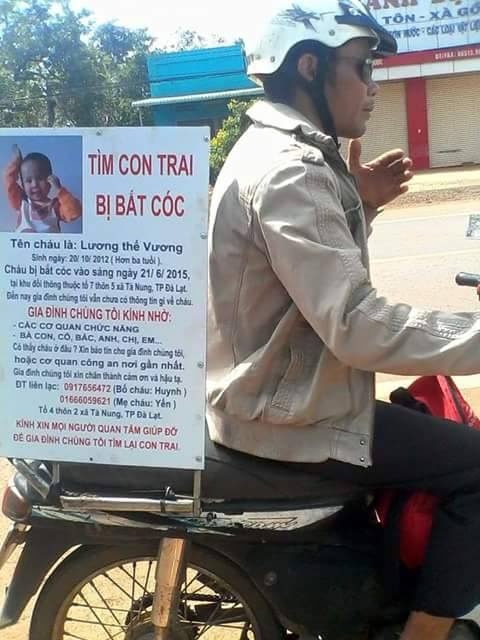 Người cha 42 tuổi đã đi xe máy, gắn tấm bảng in hình cùng thông tin Tìm con trai bị bắt cóc, rong ruổi nhiều tỉnh thành như Lâm Đồng, TP HCM, Đồng Nai, Bình Phước… Sau 6 tháng, đến nay, anh Huynh vẫn chưa tìm được con trai.