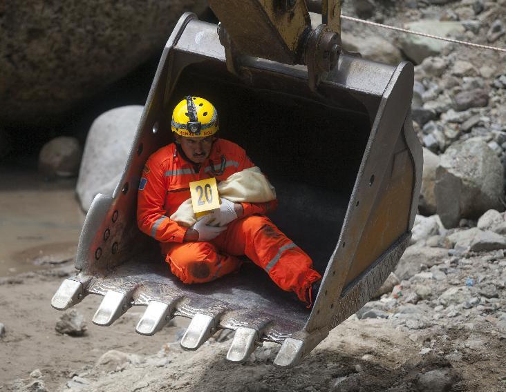 Nhân viên cứu hộ ôm xác một đứa trẻ được đánh số thứ tự 20 ngồi trong gầu của chiếc máy xúc. Cánh tay máy sẽ đưa nhân viên cứu hộ và đứa trẻ tới khu vực khác để người ta nhận dạng đứa trẻ. |