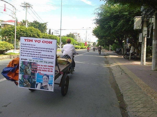 Ngày 1/7, tấm ảnh người đàn ông chạy xe ba gác, chở theo sau tấm bảng lớn với dòng chữ in đậm "Tìm vợ con", bên cạnh là hình người phụ nữ ôm đứa trẻ, số điện thoại liên hệ và những lời xin lỗi vợ, lan truyền khắp các trang mạng.