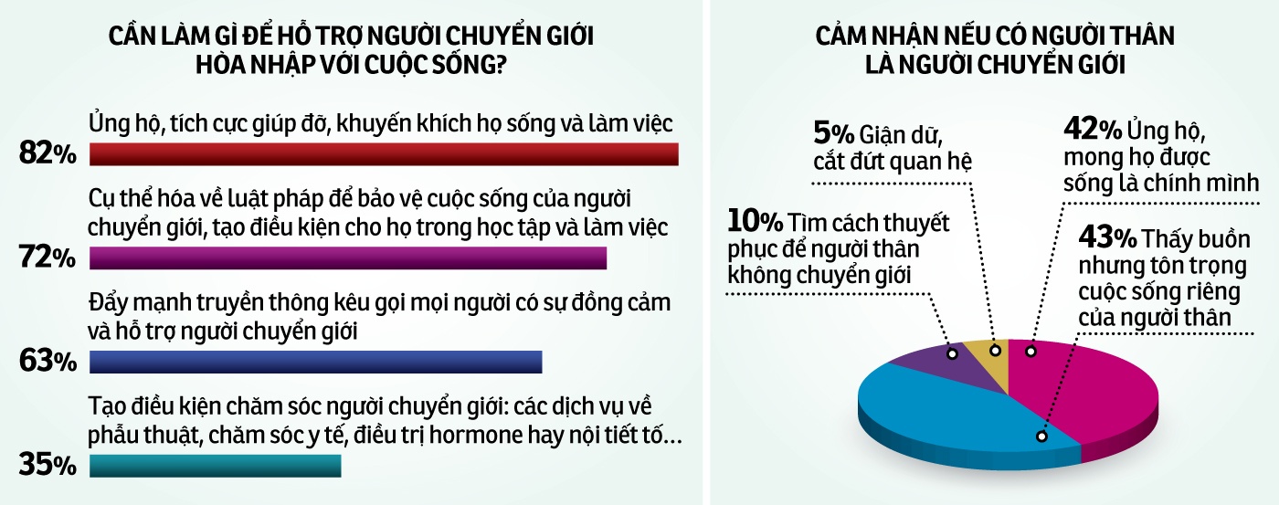 Trong đó, tỉ lệ đồng tình từ người chuyển giới lên đến 95% (19/20 người trả lời khảo sát). Xuân Tú (chuyển giới từ nam sang nữ) bộc bạch: “Nhà nước đã chấp nhận quyền chuyển đổi giới tính rồi, tôi mong ba mẹ tôi cũng sẽ hiểu, yêu thương và đón nhận đứa con này.