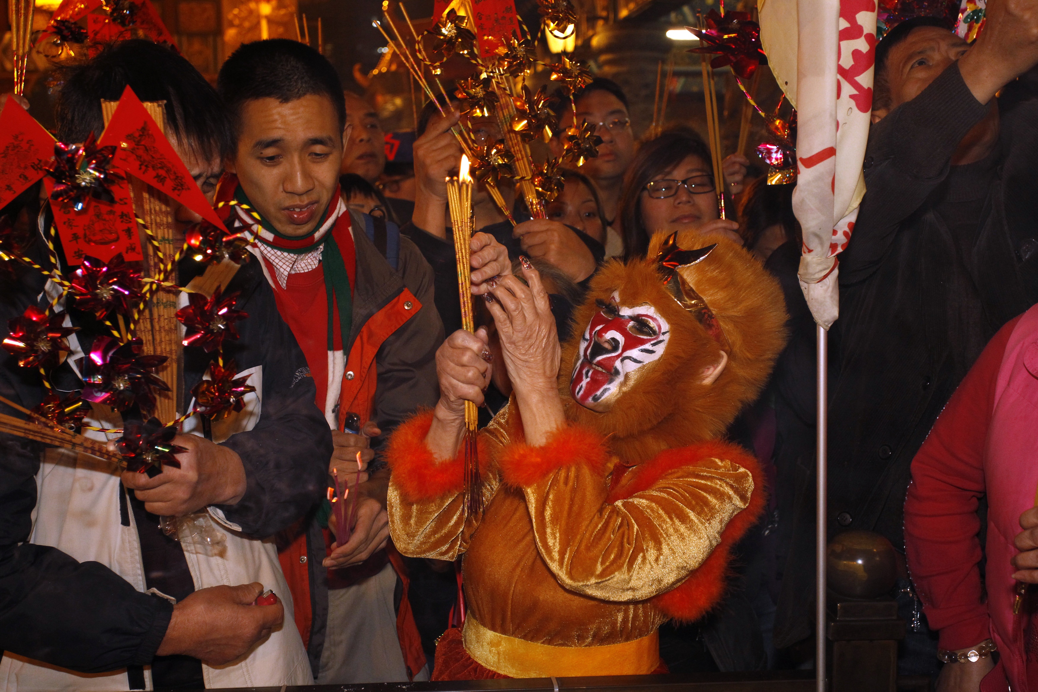 | Một người hoá trang thành nhân vật Tôn Ngộ Không để lên chùa dâng hương. Năm âm lịch 2016 là năm con khỉ theo thứ tự 12 con giáp. |