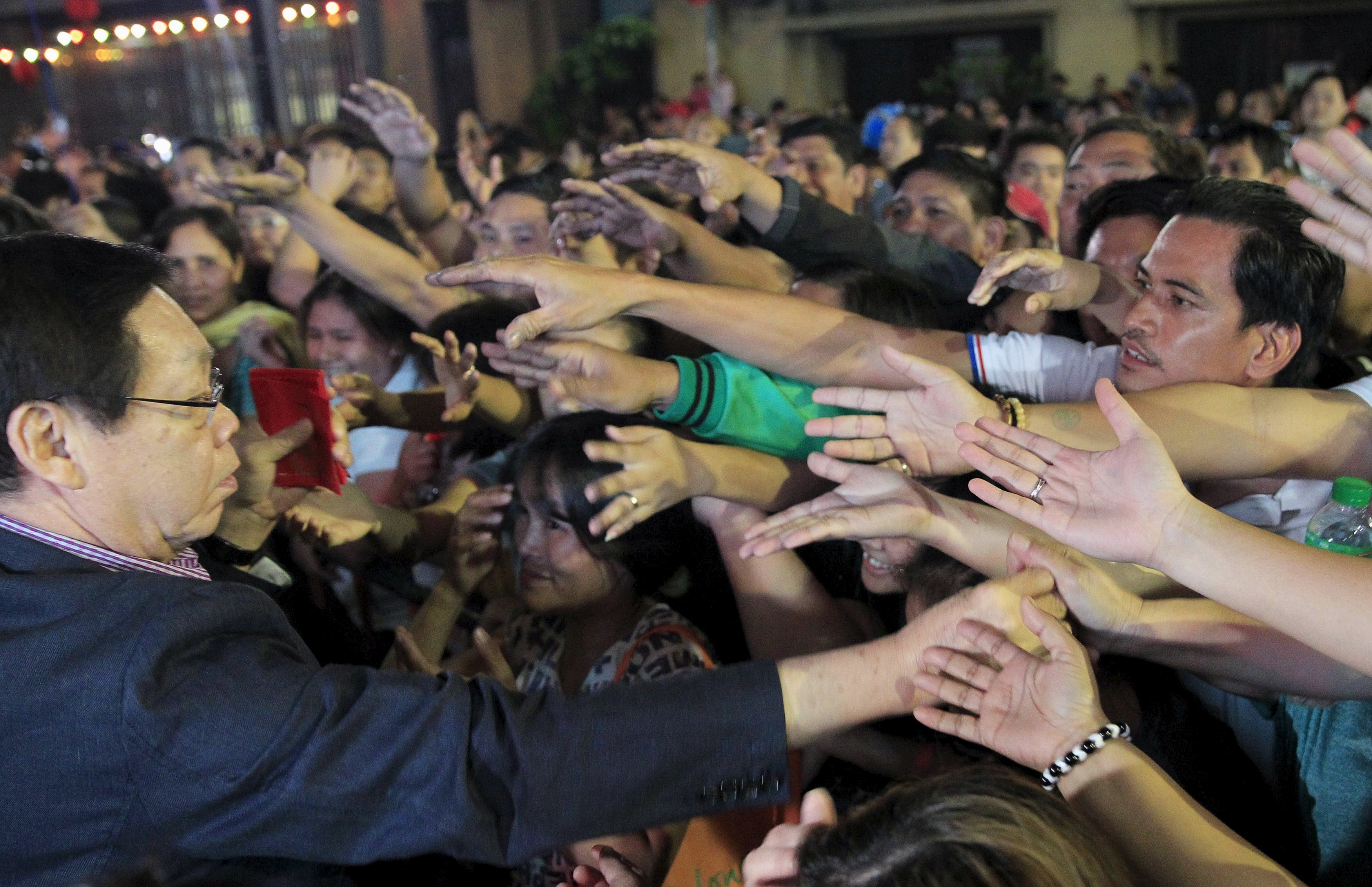 | Một doanh nhân ở Philippines phát lì xì cho người dân trong ngày đầu của Tết con khỉ. |
