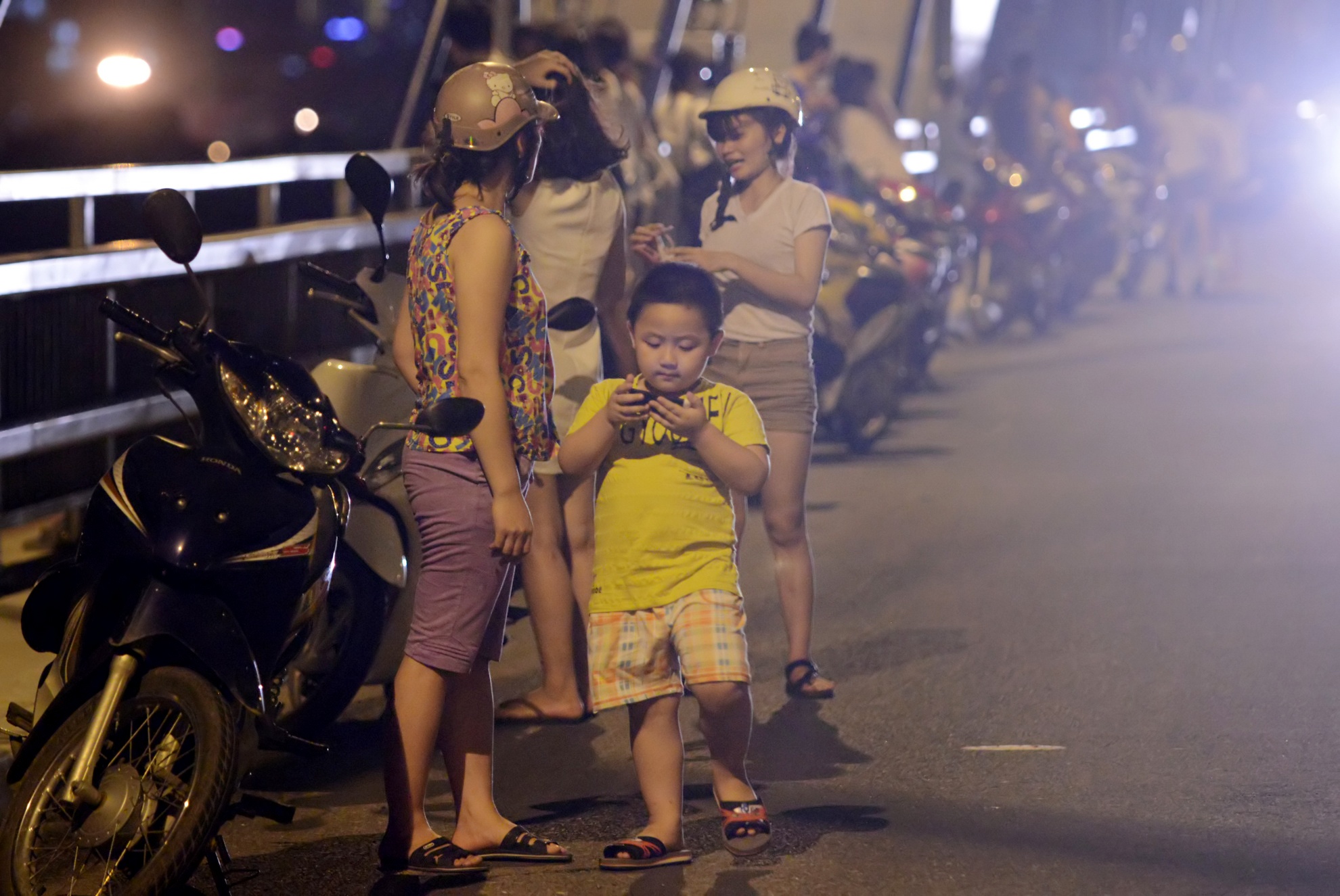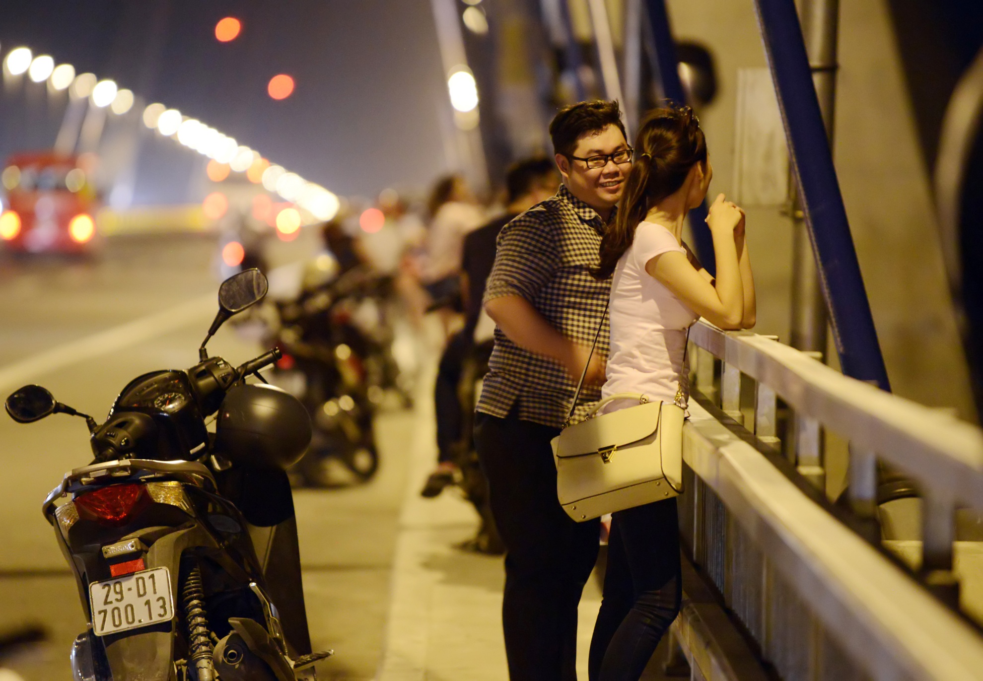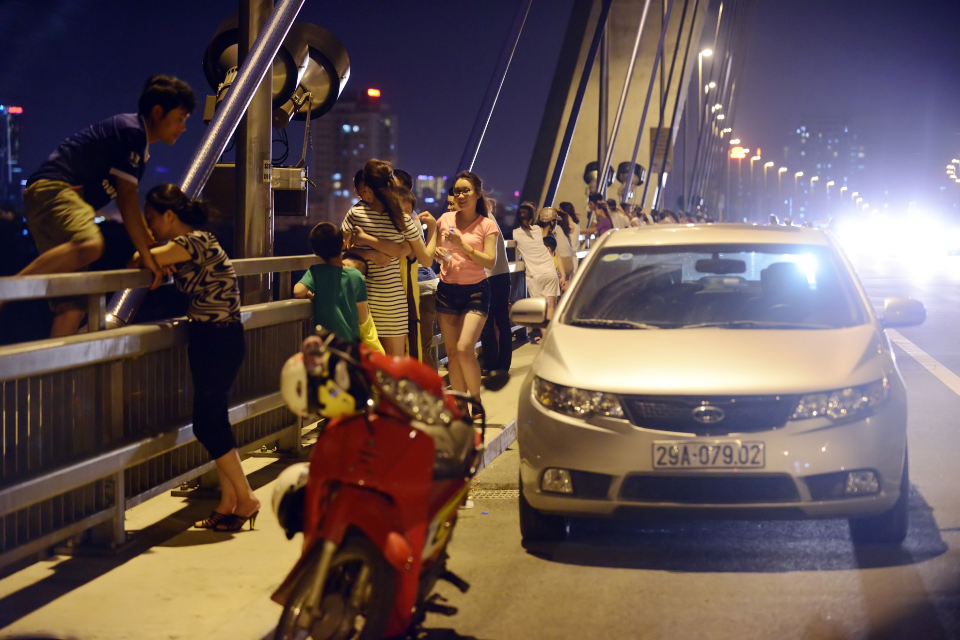 Tối 27/5, hàng trăm người dân thủ đô đổ lên cầu Nhật Tân hóng gió trong tiết trời nóng hầm hập. Xe đỗ tràn lan, hàng bán rong trà chanh bắt đầu xuất hiện.