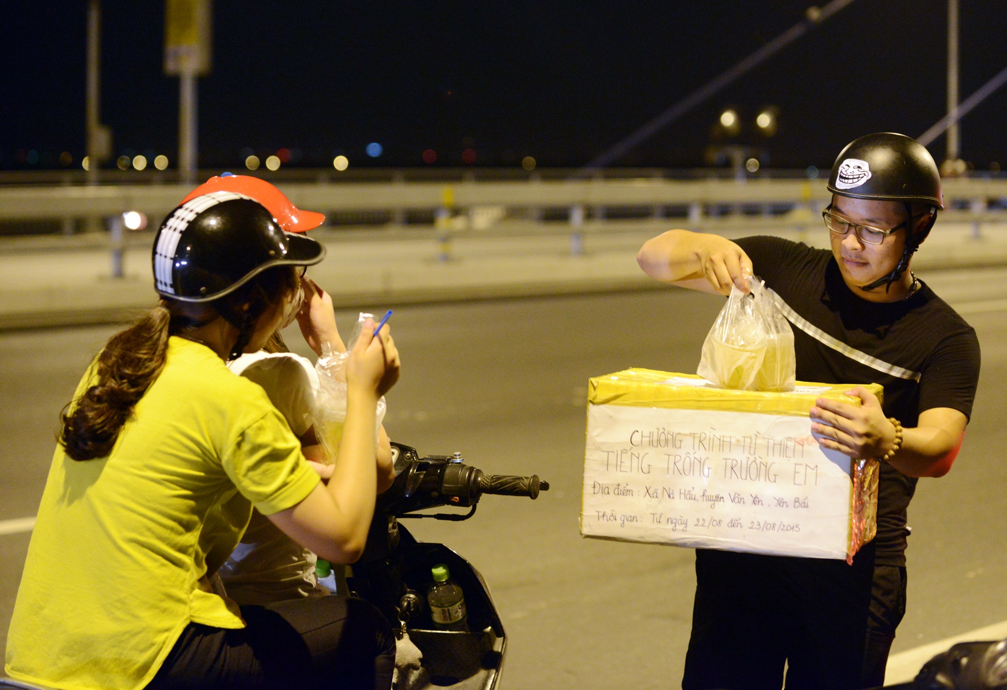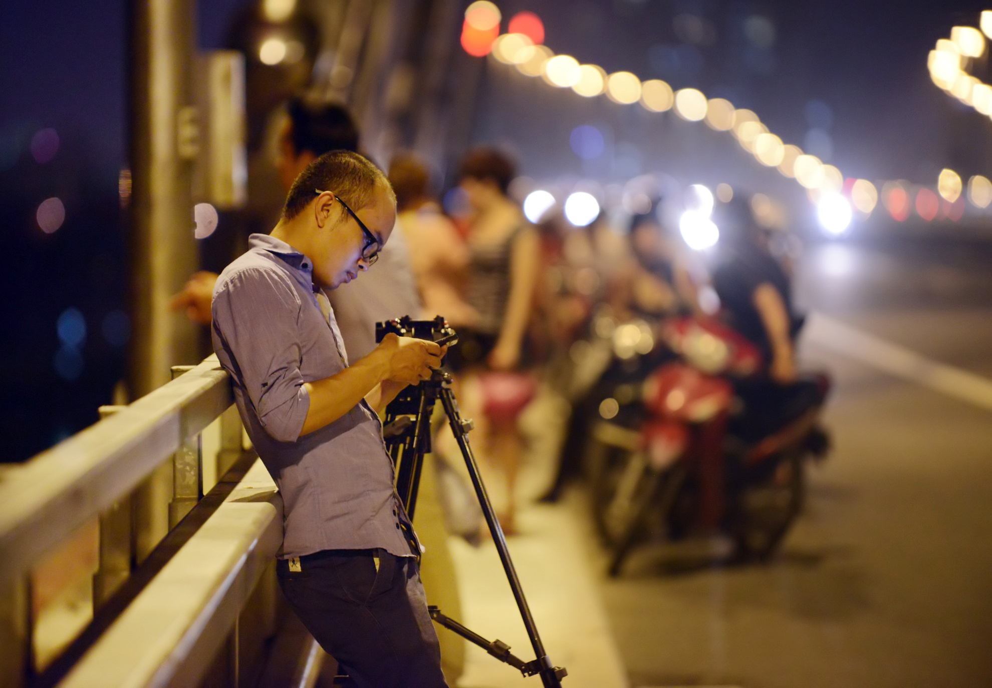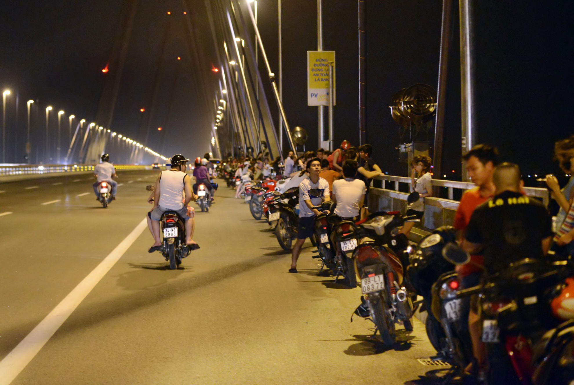 Tối 27/5, hàng trăm người dân thủ đô đổ lên cầu Nhật Tân hóng gió trong tiết trời nóng hầm hập. Xe đỗ tràn lan, hàng bán rong trà chanh bắt đầu xuất hiện.