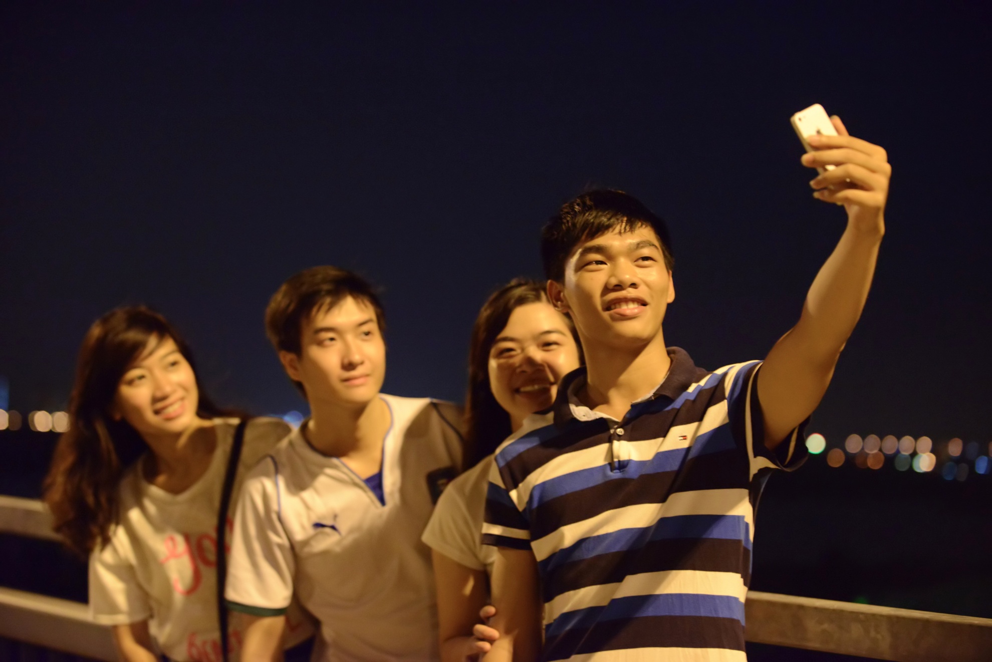 Nhóm bạn trẻ đồng hương Nghệ An tranh thủ chụp ảnh với cây cầu được coi là đẹp nhất Hà Nội.