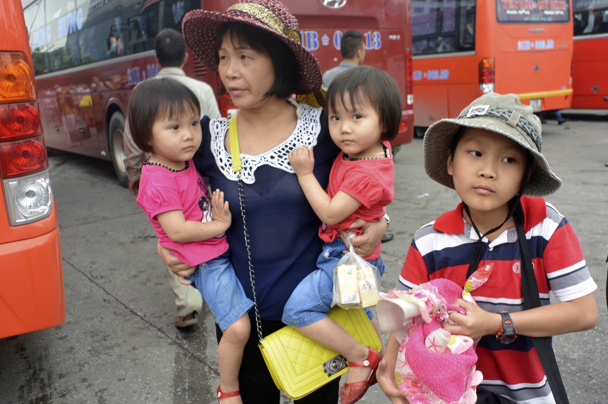 | Một phụ nữ cùng ba trẻ nhỏ cũng không tìm được xe về Bắc Giang mặc dù thường ngày tuyến này rất nhiều xe và vắng khách. |
