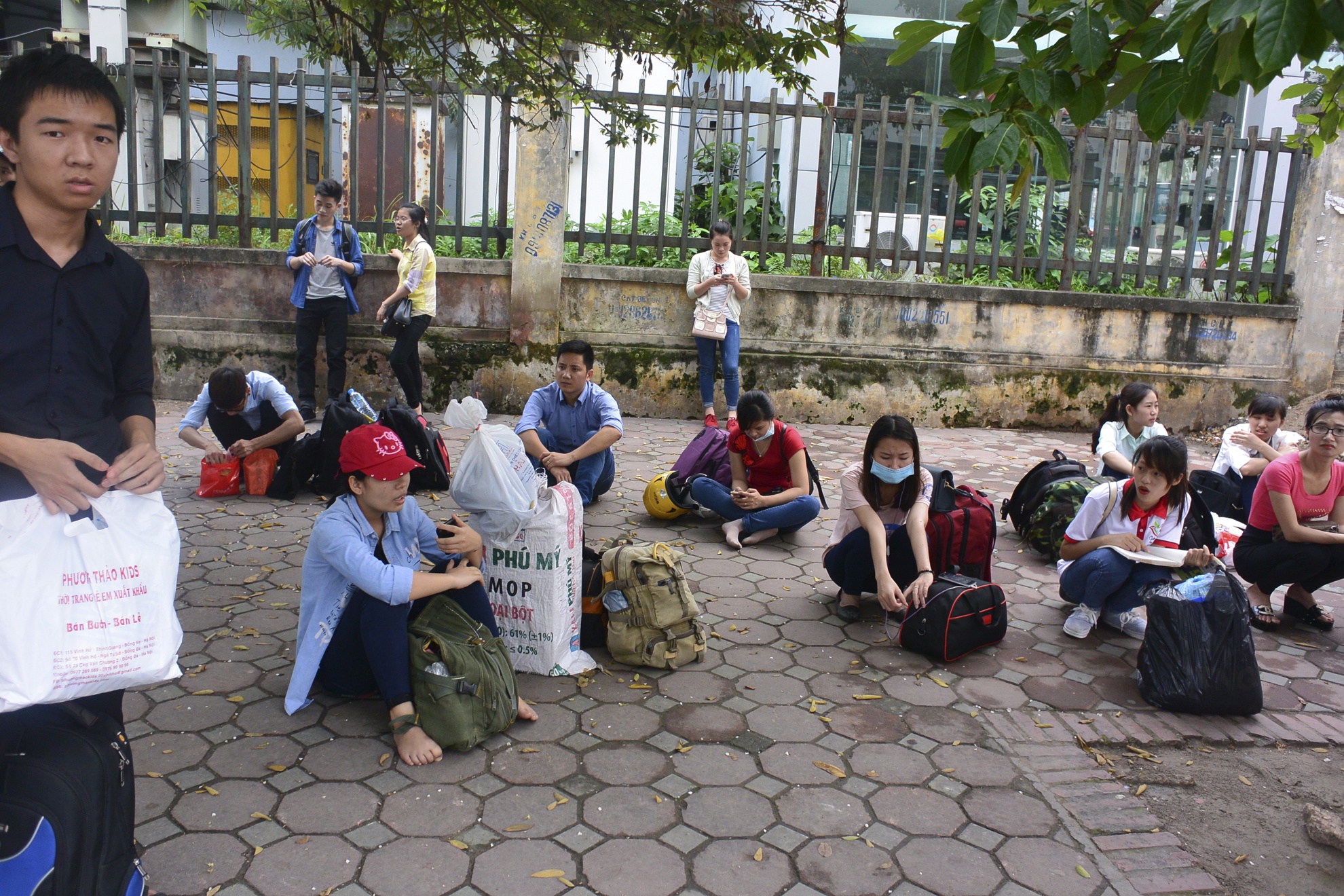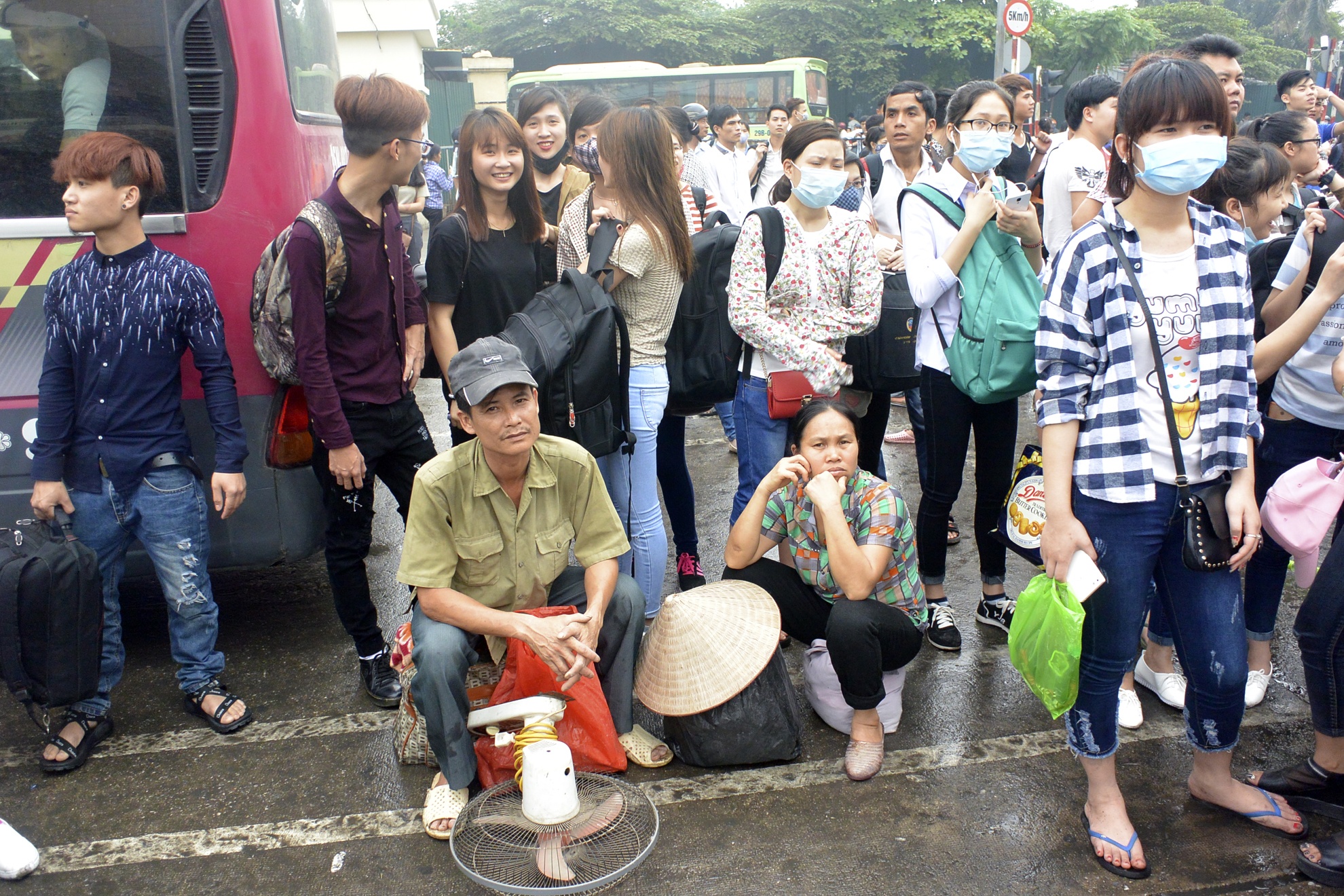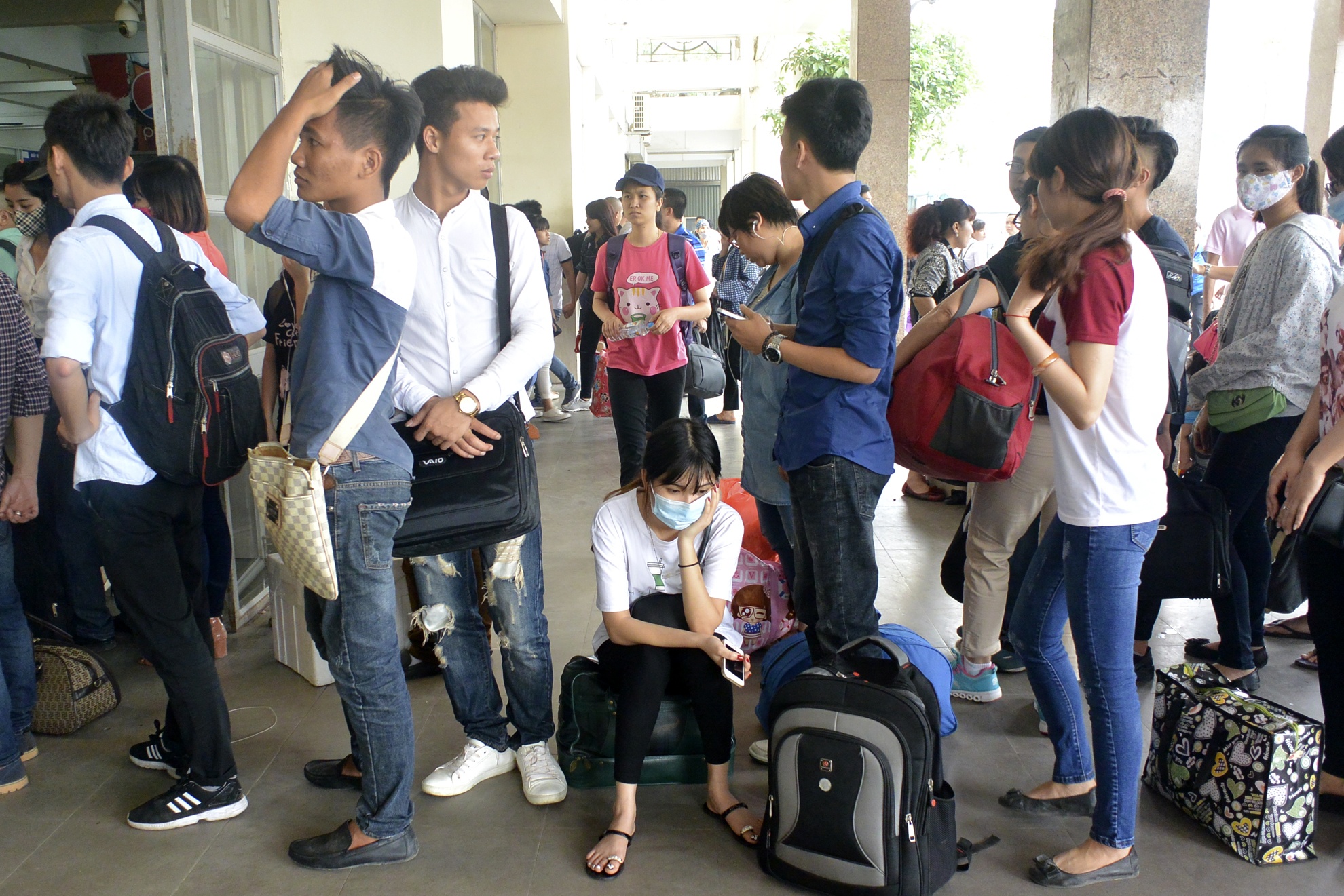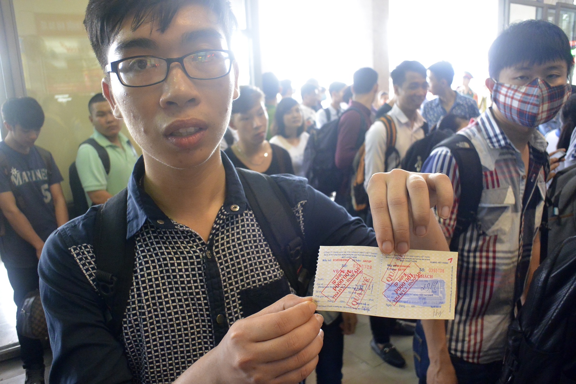 | Hàng dài các bạn trẻ vẫn quyết tâm xếp hàng chờ đợi để có được vé xe. |