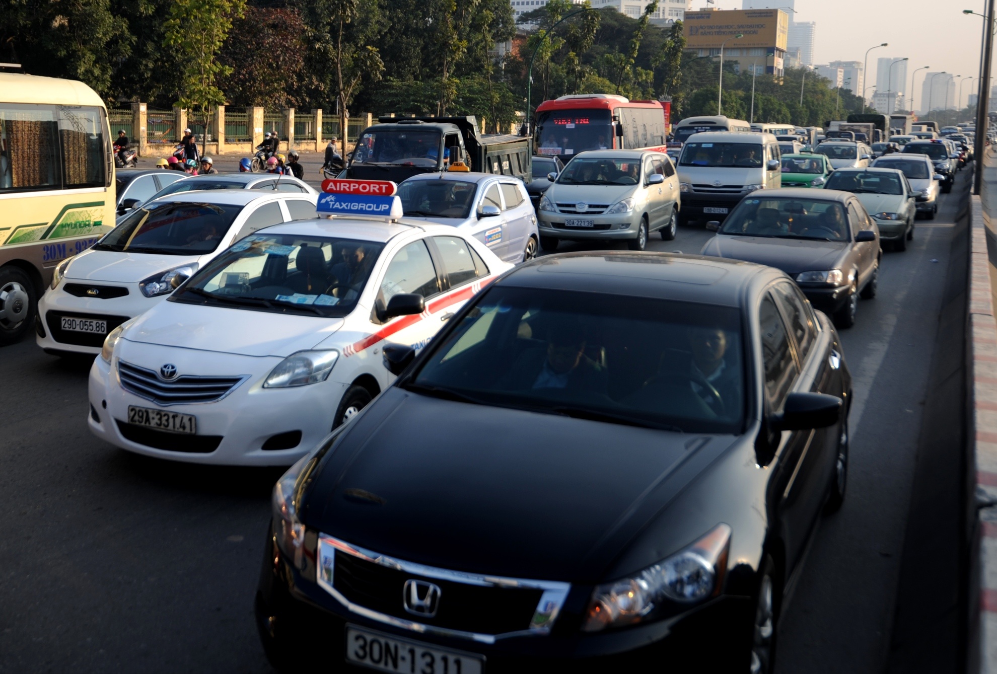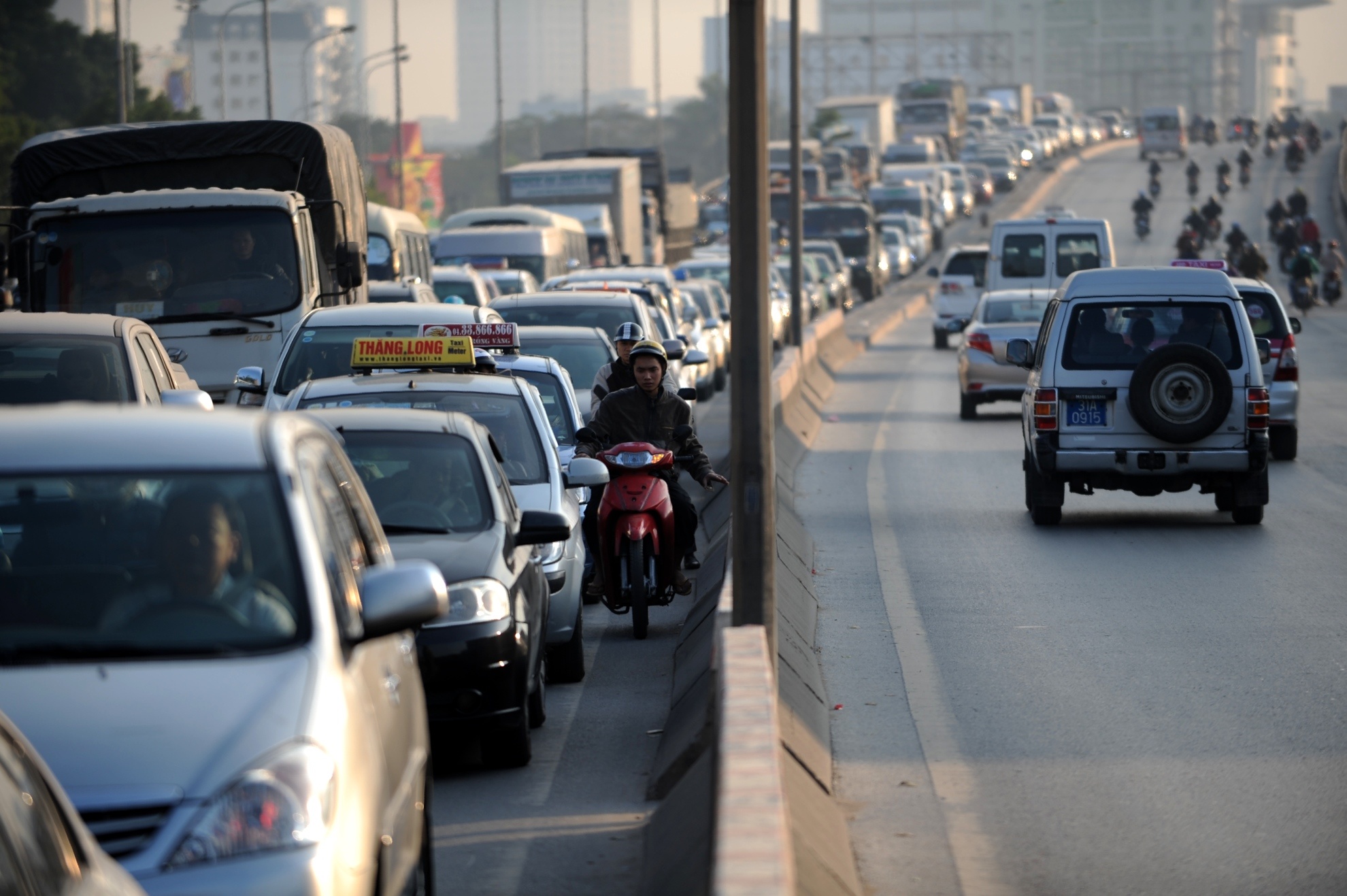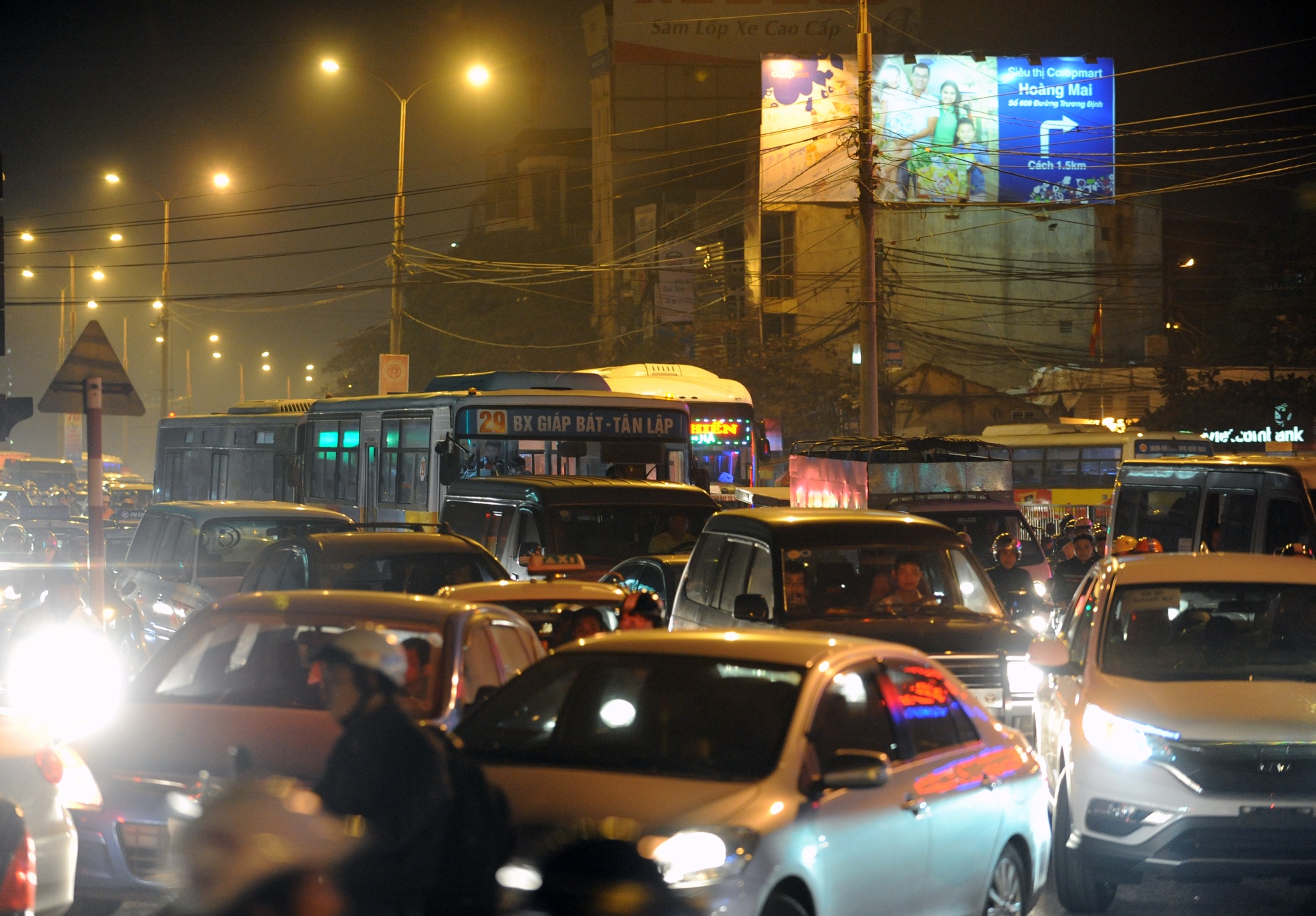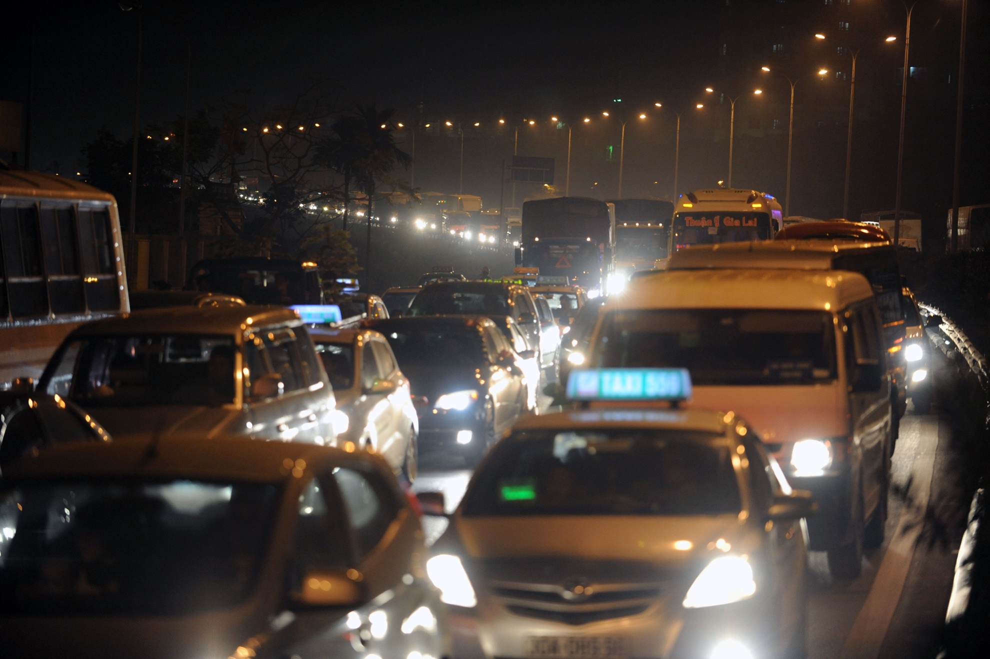 | Cửa ngõ thủ đô đoạn Giải Phóng tới cao tốc Pháp Vân - Cầu Giẽ, ô tô nối đuôi nhau xếp hàng dài vài km. |