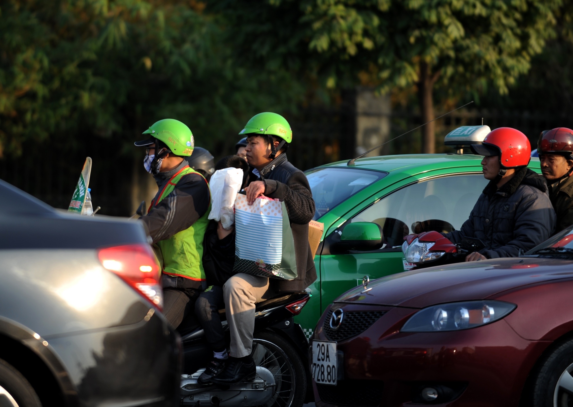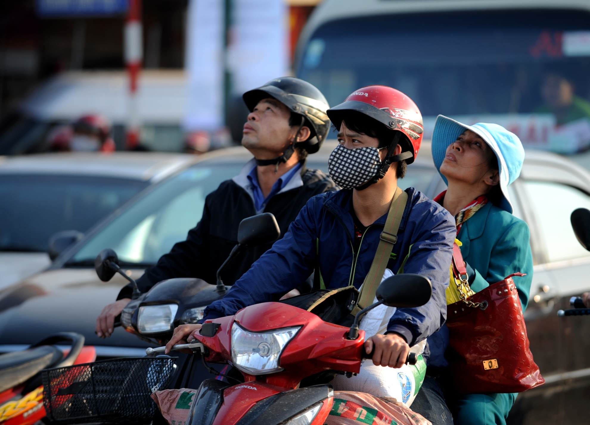 | Nhiều người đi xe máy hướng về phía ngoại thành, tay xách nách mang. |