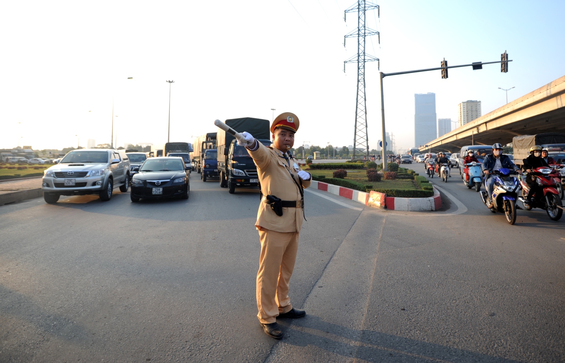 | Cảnh sát giao thông làm việc vất vả và phân luồng tránh tình trạng ô tô lấn làn xe máy. |