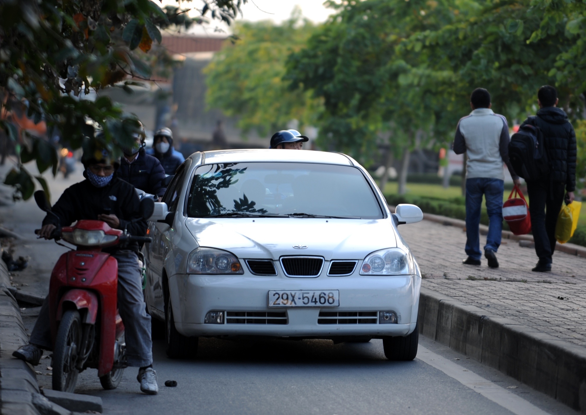 | Một chiếc ô tô đi lách vào làn xe máy định vượt lên trước tại nút Đại lộ Thăng Long - Trần Duy Hưng. |