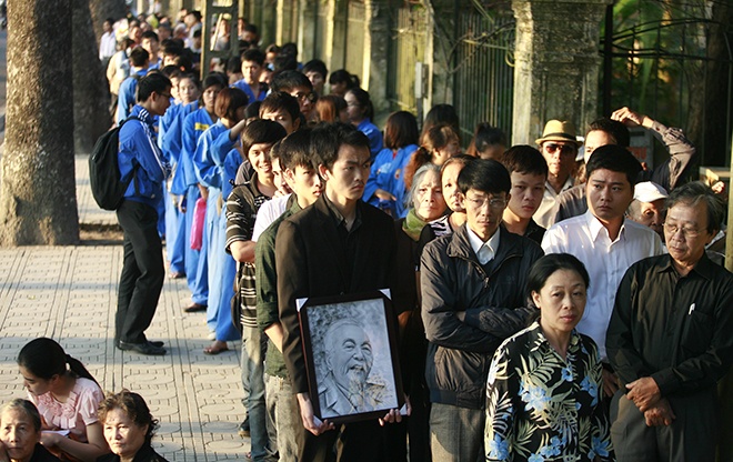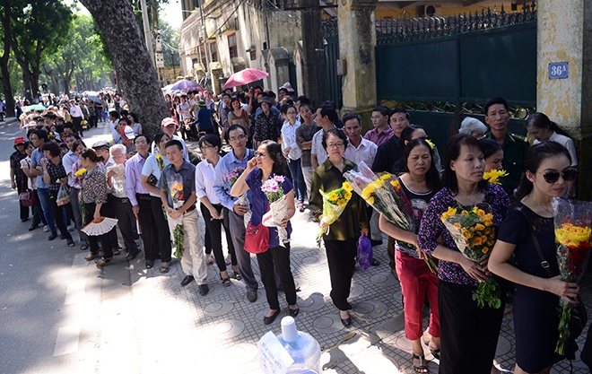 8h30 mới mở cửa cho đồng bào vào viếng nhưng từ 6h sáng hàng người đã xếp hàng kéo dài.