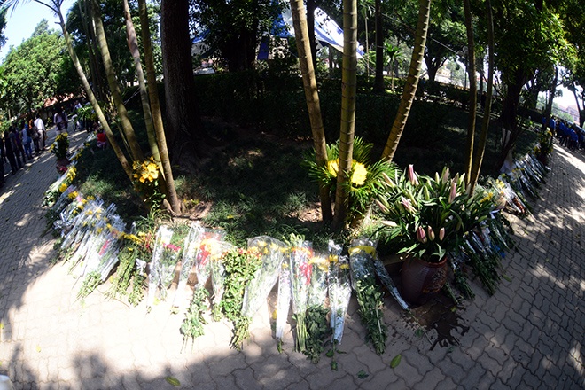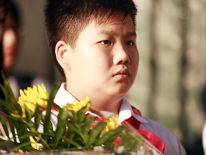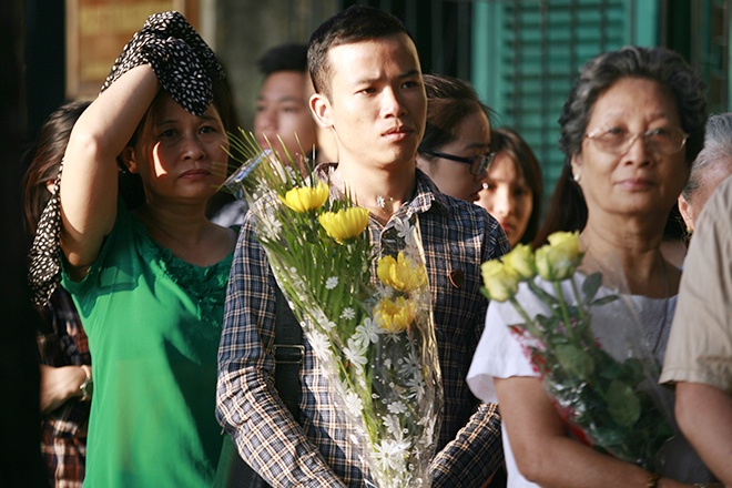 Bé Nguyễn Nam, học sinh lớp 8 trường Chu Văn An (Hà Nội) ôm trên người bó hoa có mặt từ 6h sáng để chờ đến lượt vào viếng. Cũng như nhiều người khác, hôm qua bé Nam đến nhưng hết giờ vào thăm.