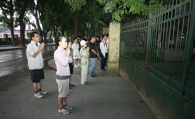 Một số người dân sống gần đó trong khi đi tập thể dục buổi sáng cũng tranh thủ ghé ngang chắp tay từ biệt.