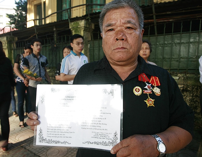 Cựu chiến binh Nguyễn Kim Lợi đến từ Long Biên và bài thơ tự viết về tướng Giáp, bài thơ có đoạn: "Võ Nguyên Giáp cụ uy nghi/ Vĩnh biệt Cụ hãy nén ghì đau thương/ Giữa thế kỷ một chặng đường/ Gương hào kiệt cụ làm gương cho đời".