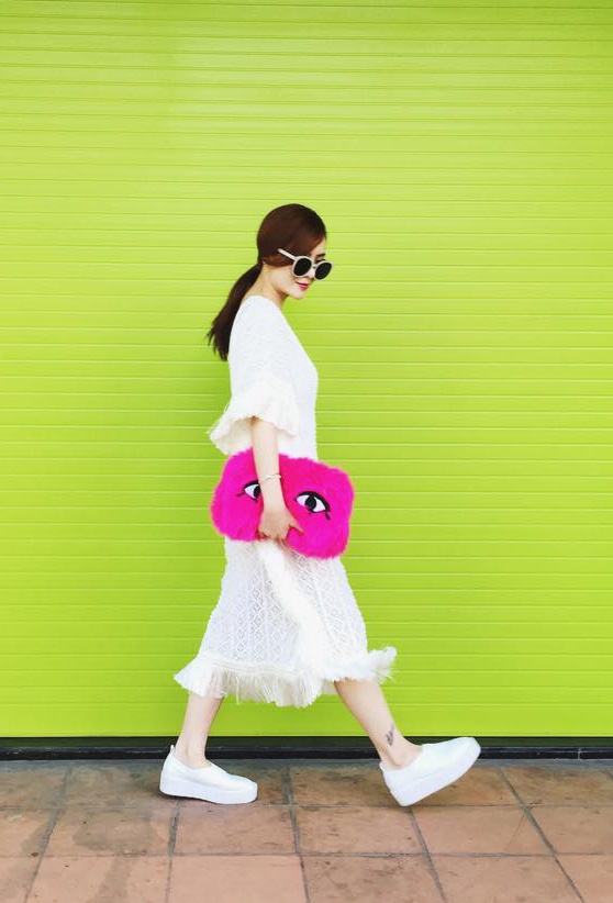 | Giống chị gái Yến Trang, khi tản bộ dịp Tết, Yến Nhi cũng chọn set trang phục trắng tinh thanh thoát. Bộ váy chất liệu ren hiện đại, được diềm tua rua tinh tế tại gấu váy. Nữ ca sĩ chọn phụ kiện túi lạ mắt gam hồng nổi bật, giày đế "bánh mì" cá tính. |
