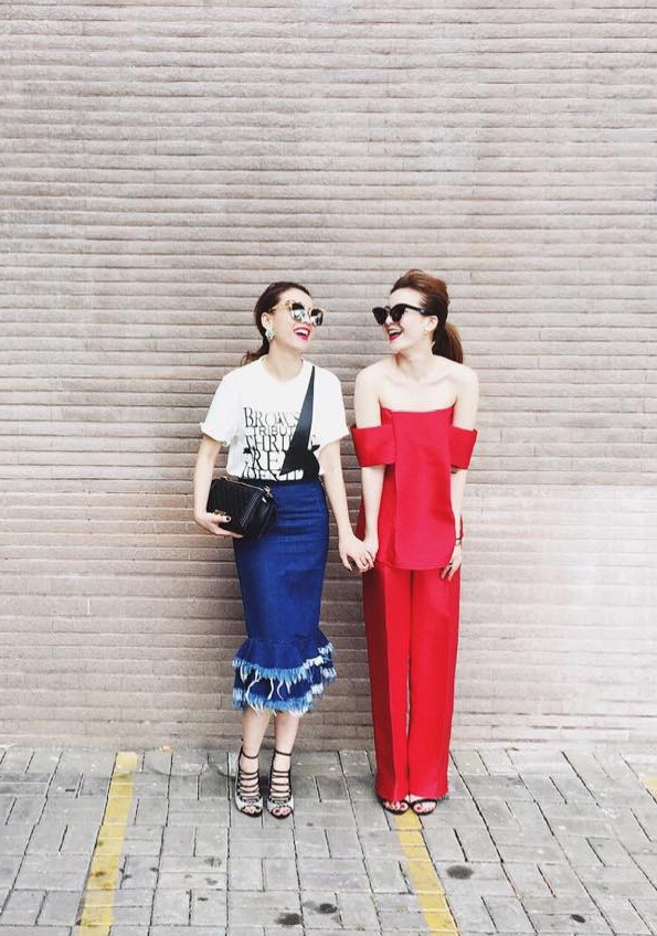 | Sau mùng 3 Tết, cặp chị em sành điệu tiếp tục khoe những bộ cánh hợp xu hướng xuân hè 2015. Yến Trang diện váy bút chì denim phá cách, trong khi đó Yến Nhi nổi bật hơn hẳn nhờ tông màu đỏ truyền thống. Hai chị em thu hút sự chú ý khi sải bước trên đường phố xuân Sài thành. |