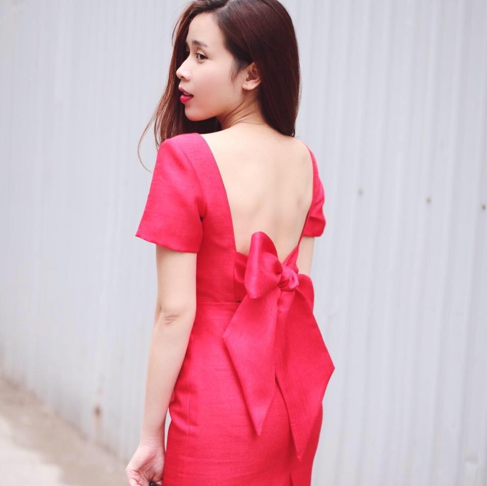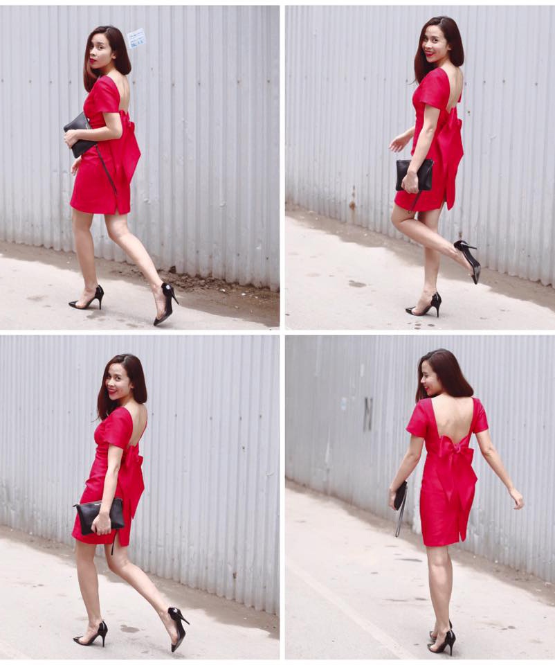 | Bà mẹ một con Lưu Hương Giang chọn trang phục gam màu đỏ truyền thống khi xuống phố đầu năm. Bộ cánh khoe trọn tấm lưng trần, phụ kiện nơ đồng màu mang lại nét duyên dáng, trẻ trung cho người mặc. |
