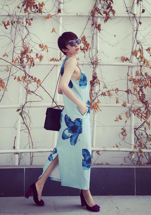 | Ca sĩ Tóc Tiên xuống phố với phong cách thời trang hiện đại. Người đẹp diện váy suông gam màu xanh da trời, họa tiết in hoa đồng tông nổi bật. Trang phục đậm hương sắc mùa xuân giúp cô nổi bật trên đường phố Mỹ và nhận được không ít lời khen về cách chọn trang phục hợp không khí xuân cận kề. |