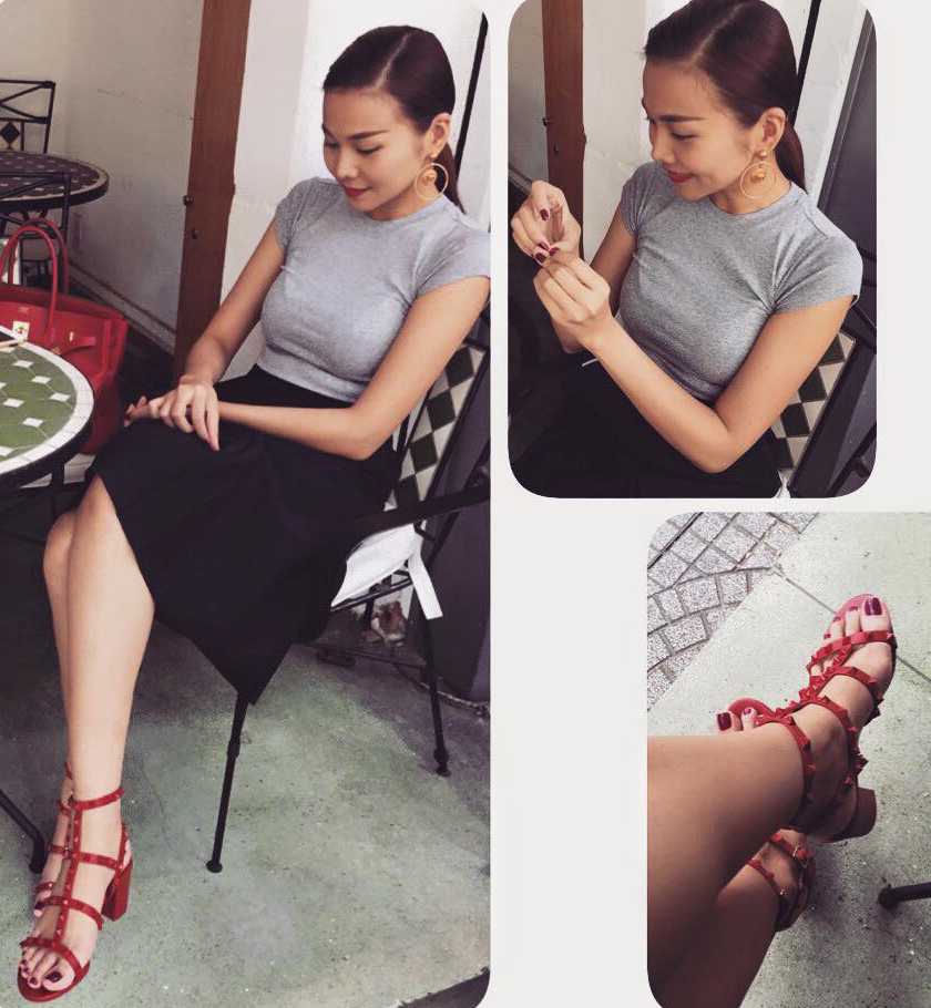 | Phong cách những ngày Tết của siêu mẫu không khác đời thường là mấy. Cô vẫn chuộng lối mix tối giản và mạnh mẽ. Set trang phục xám đen, phụ kiện giày sandals bắt mắt làm điểm nhấn. |