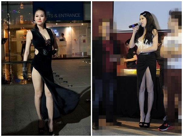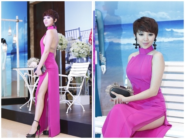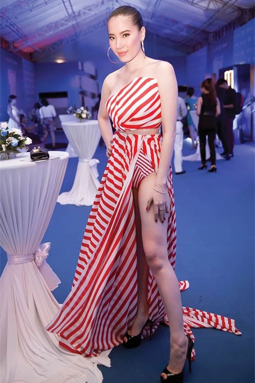 | Trà Ngọc Hằng diện trang phục quyến rũ khi dự sự kiện vào trung tuần tháng 4, tại TP HCM. Tuy nhiên, bộ váy cắt cao táo bạo đã khiến người mặc lúng túng khi di chuyển. Thậm chí, những góc ảnh nghiêng đã cho thấy khoảng hở không đẹp mắt. |