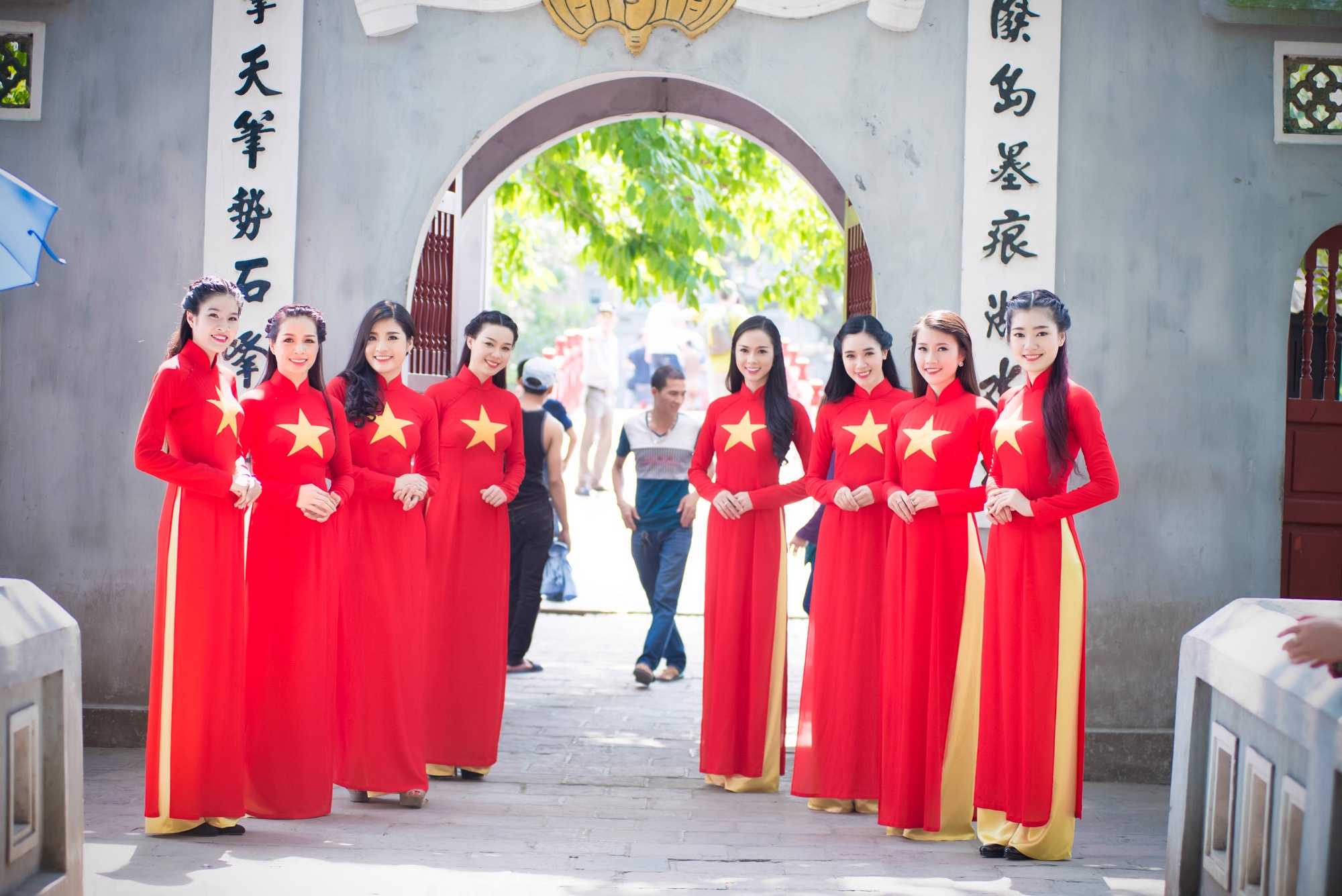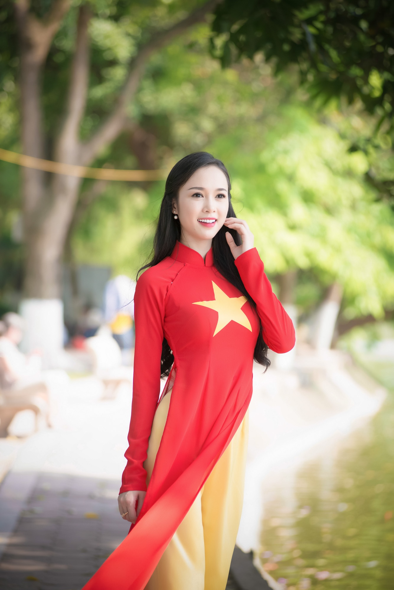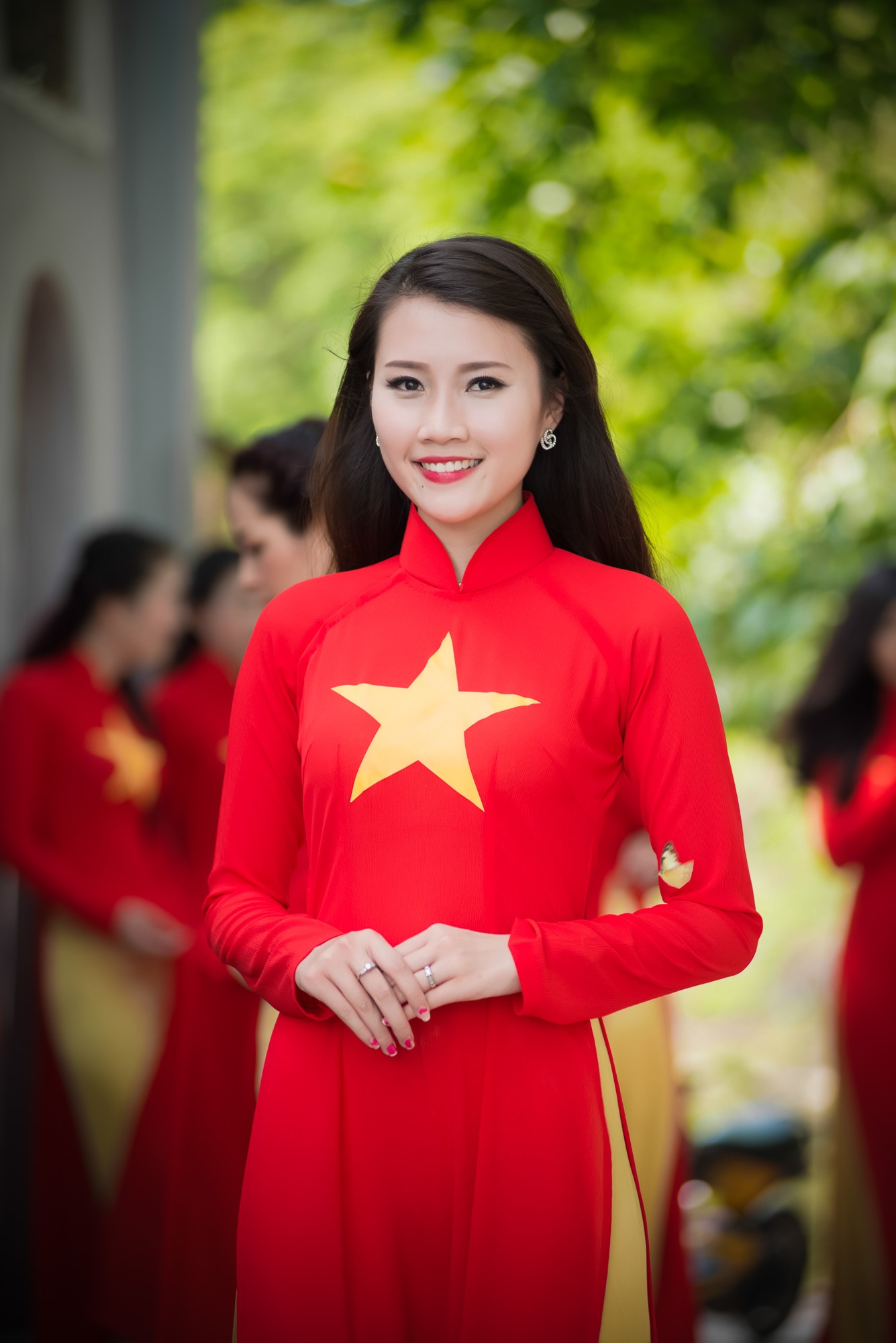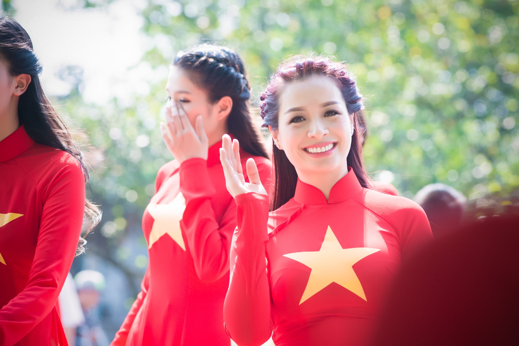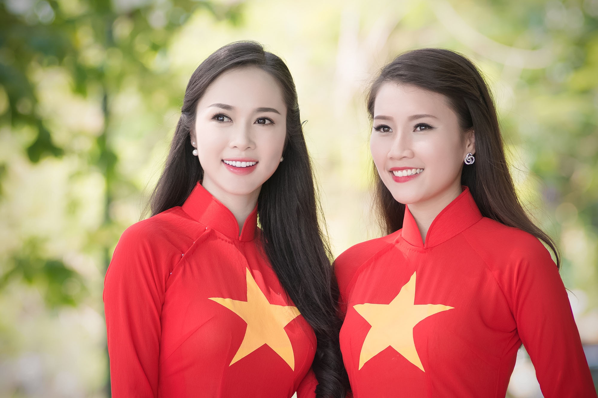 | Người đẹp tự hào khi khoác lên mình tà áo dài truyền thống, trong màu áo cờ đỏ sao vàng đầy ý nghĩa. |