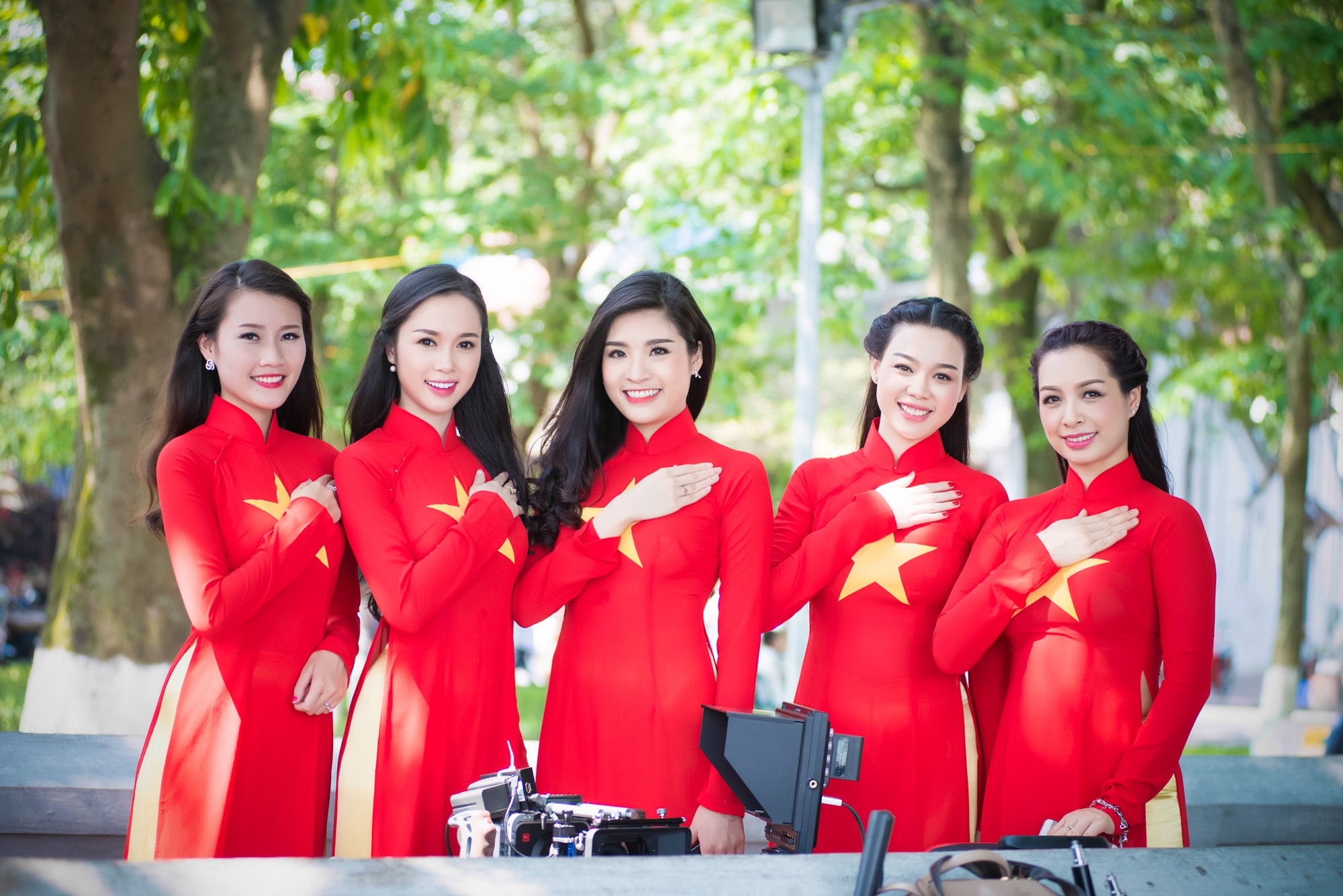 | Thúy Hằng cùng các đàn em chọn trang phục áo dài "cờ đỏ sao vàng" nổi bật. |