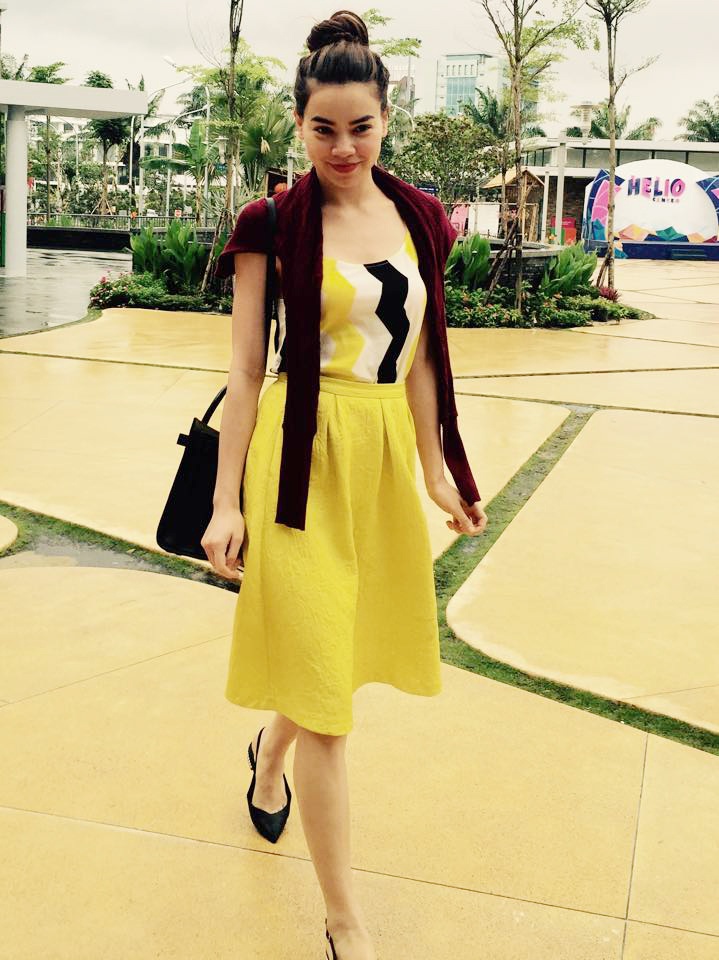 Trên trang cá nhân, Hồ Ngọc Hà khoe hình ảnh mới trong chuyến công tác tại Đà Nẵng vào cuối tuần. "Nữ hoàng giải trí" diện bộ cánh tông màu vàng bắt mắt, hợp xu hướng. Áo khoác hờ trên vai và kiểu tóc búi hiện đại.
