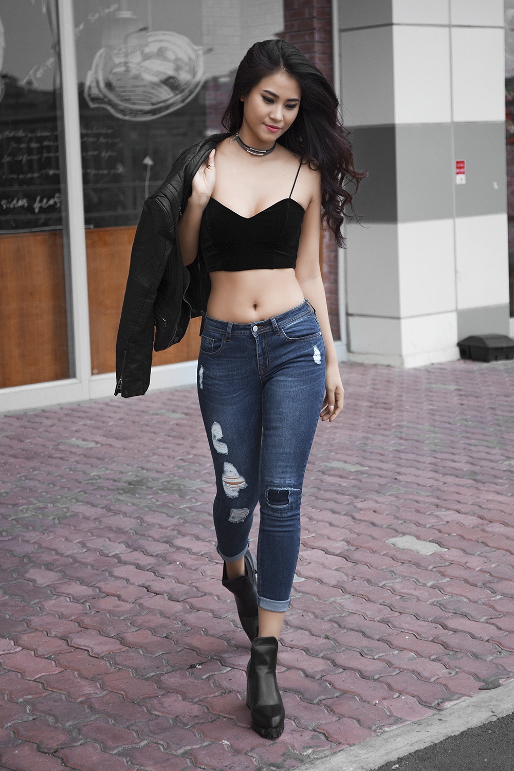 Người đẹp biển Vân Anh dạo phố với set đồ phá cách. Jeans và áo bra-top hai dây gợi cảm giúp chân dài khéo khoe làn da nâu khỏe khoắn.