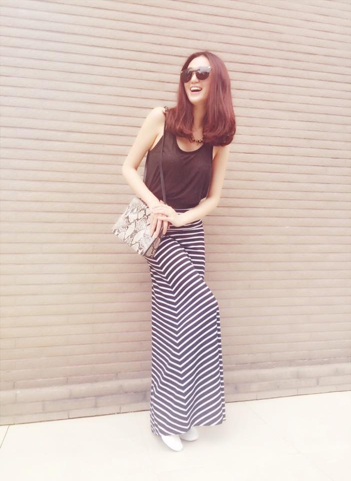 Người đẹp Khánh My có cách chọn trang phục đơn giản, chân váy sọc kẻ và áo thun hiện đại.
