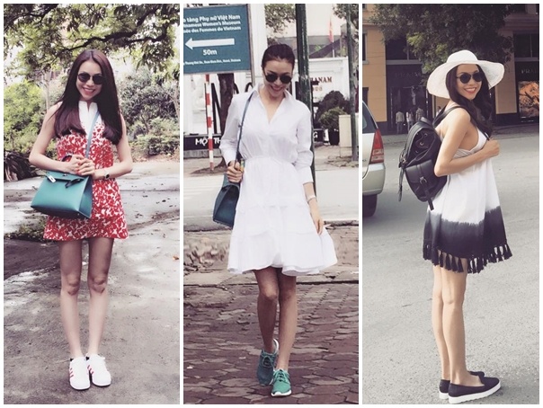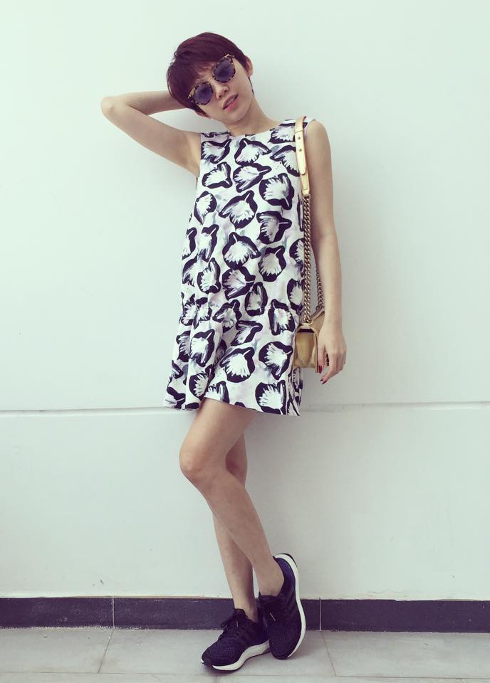 | Trong khi đó, Tóc Tiên xuống phố với chiếc váy suông, in họa tiết hoa nữ tính. Giày thể thao phối cùng ăn ý cho thấy vẻ trẻ trung, năng động của nữ ca sĩ hải ngoại. |