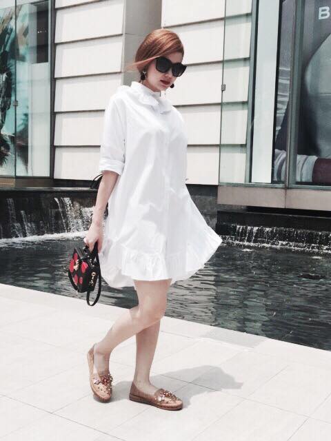 | Trên đường phố Sài thành, Minh Hằng nổi bật với bộ váy tông trắng nhã nhặn và trong trẻo. Thiết kế có diềm bèo tại cổ áo và chân váy tăng nét nữ tính, yêu kiều. Giọng ca Sắc môi em hồng diện giày bệt và túi xách hàng hiệu dáng vuông ăn nhập. |