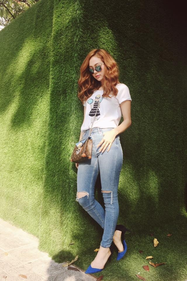| Một ngày khác, nữ ca sĩ Sài thành diện quần jeans xé gấu mix kèm áo thun đơn giản. Cô tự tin thả bộ với phong thái thoải mái và trang phục phóng khoáng, phù hợp không khí hè. |