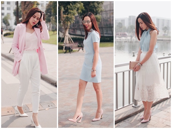 Những ngày đầu tuần, Lưu Hương Giang chọn phong cách pastel thanh lịch. Các set đồ sắc trắng, hồng, xanh nhạt đi cùng tông tạo tổng thể ưa nhìn, duyên dáng.