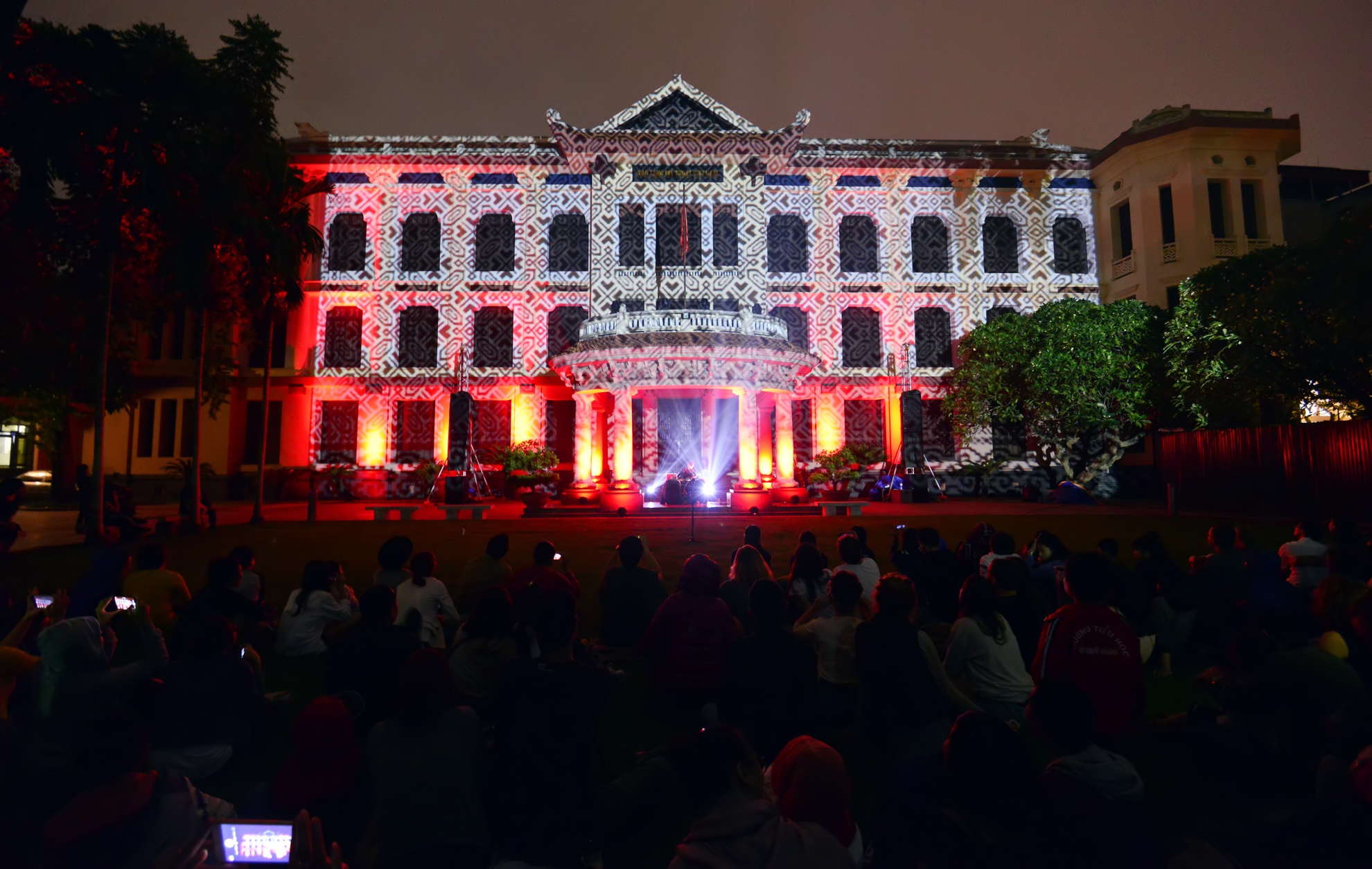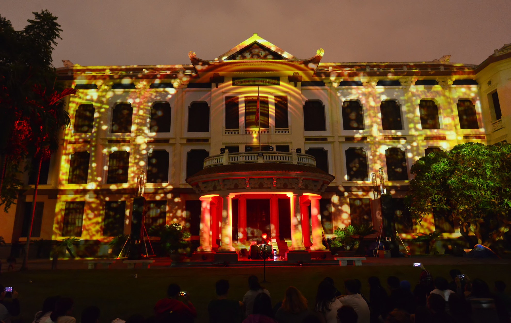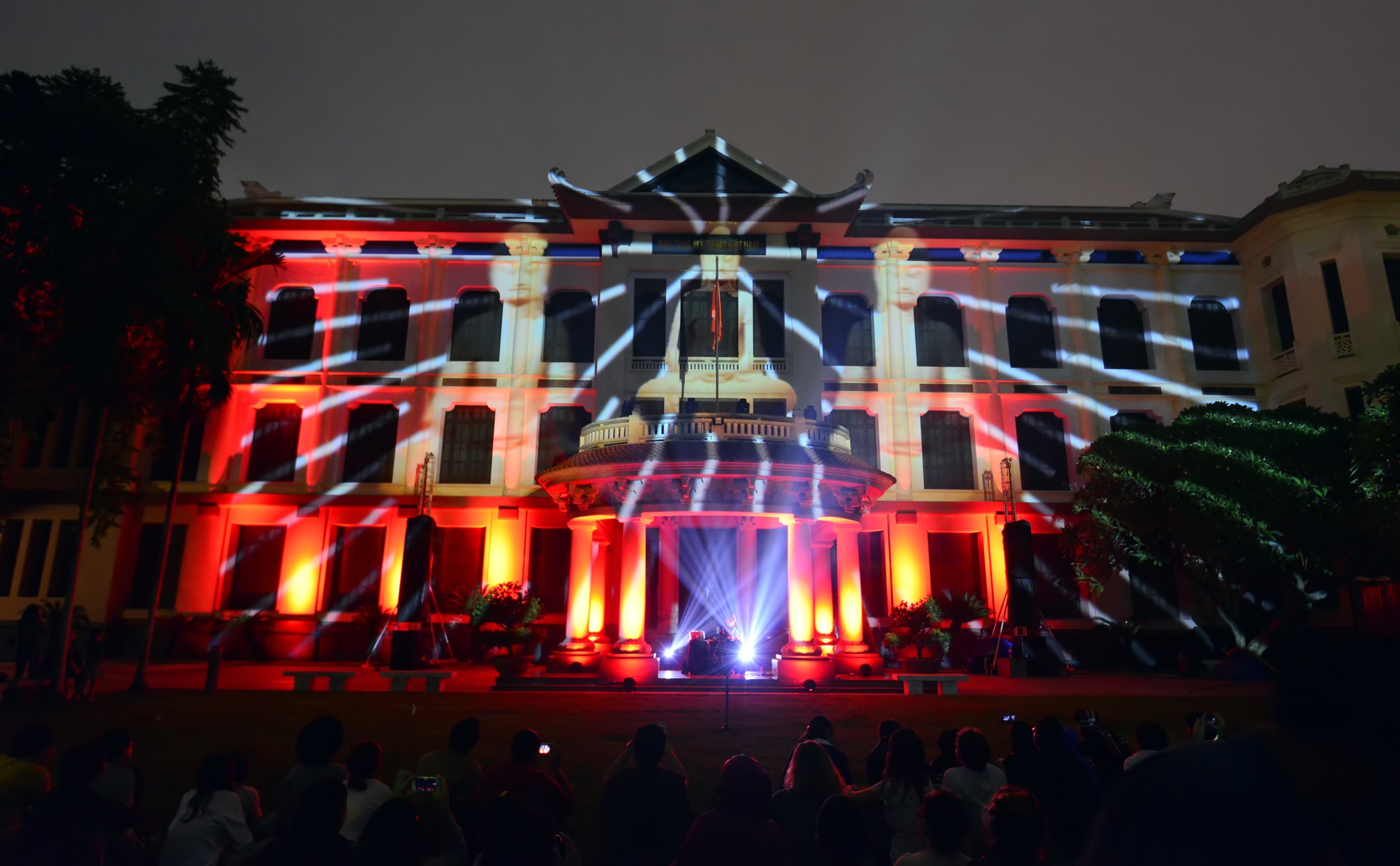 | Khán giả ghi lại sự biến chuyển ánh sáng kỳ diệu trên mặt tiền của bảo tàng Mỹ thuật Việt Nam. |