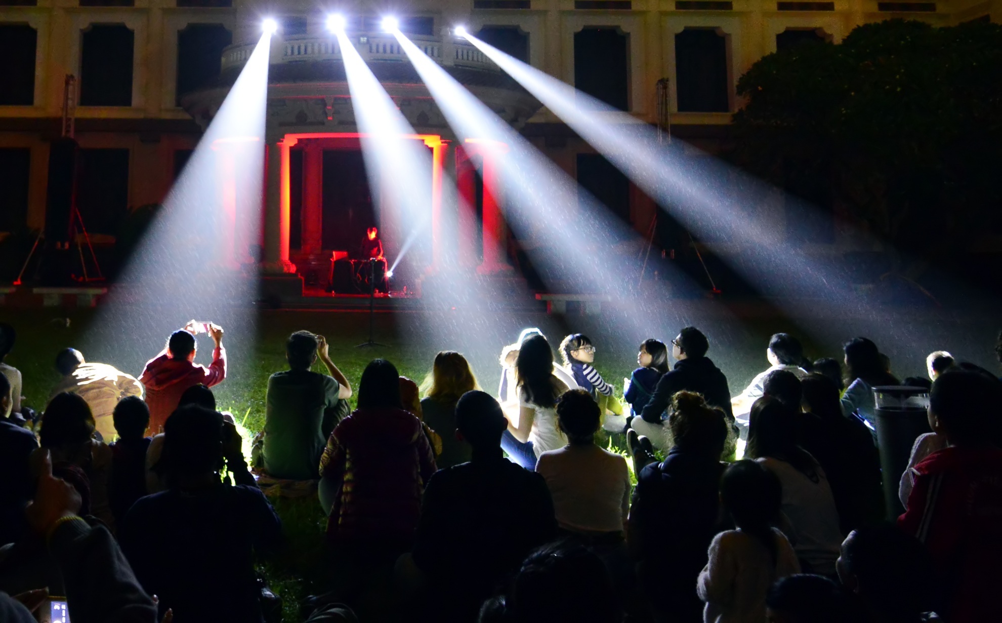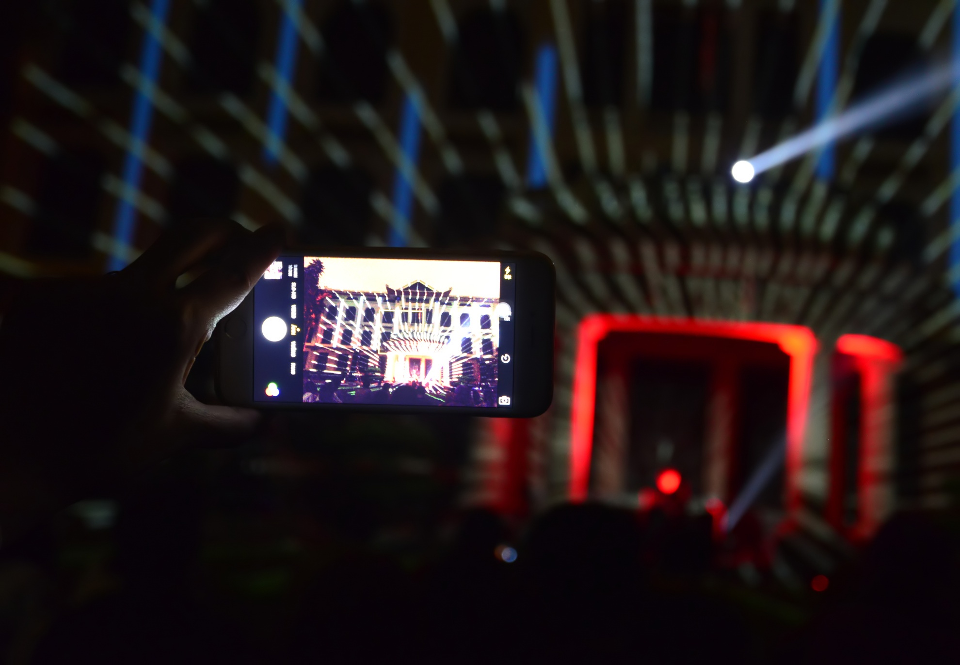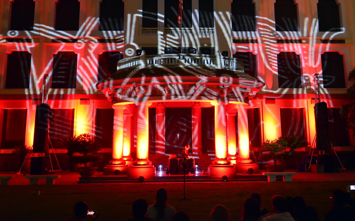 | Khán giả ghi lại sự biến chuyển ánh sáng kỳ diệu trên mặt tiền của bảo tàng Mỹ thuật Việt Nam. |
