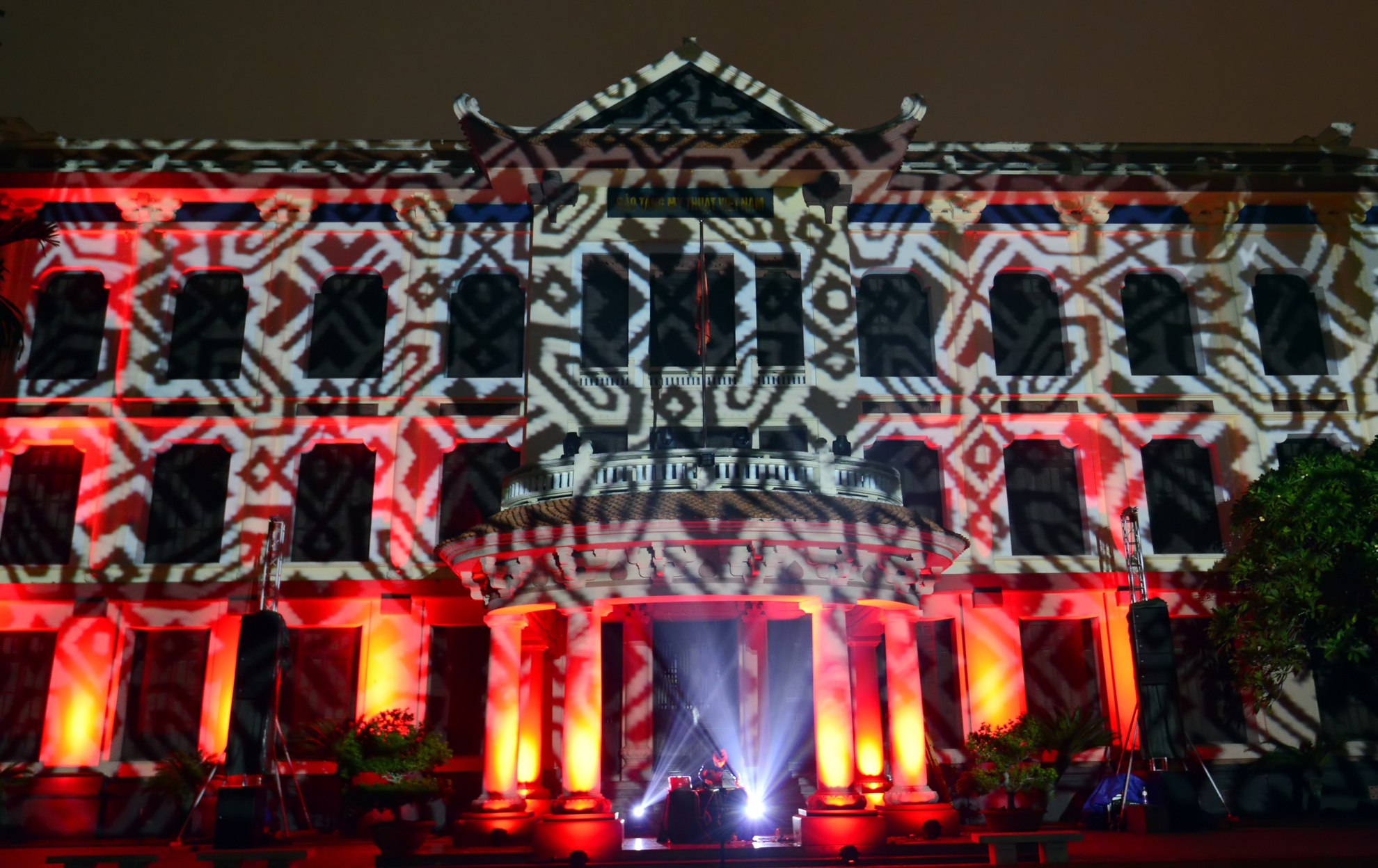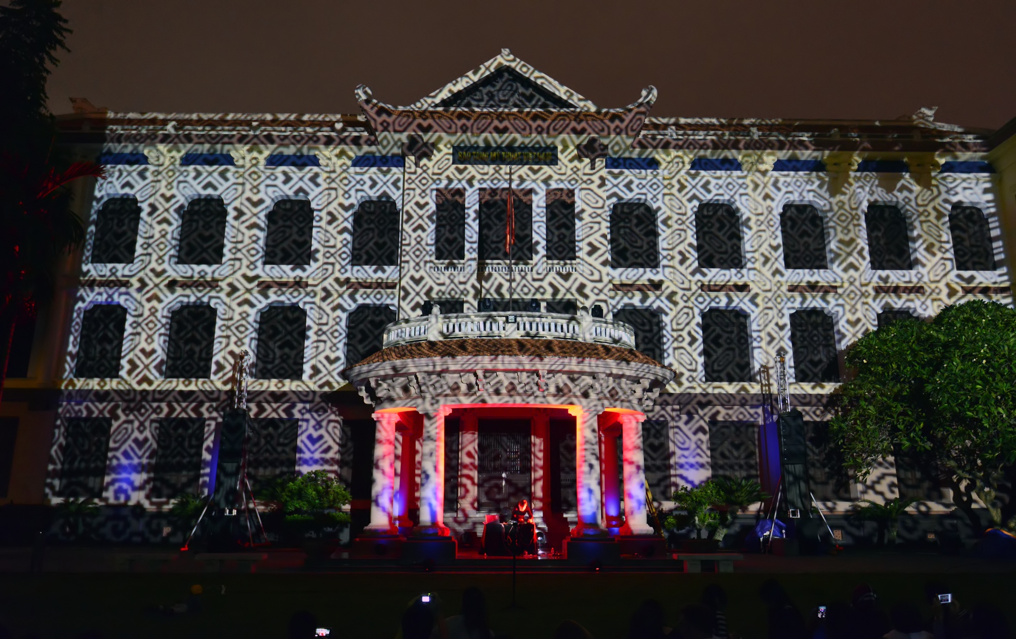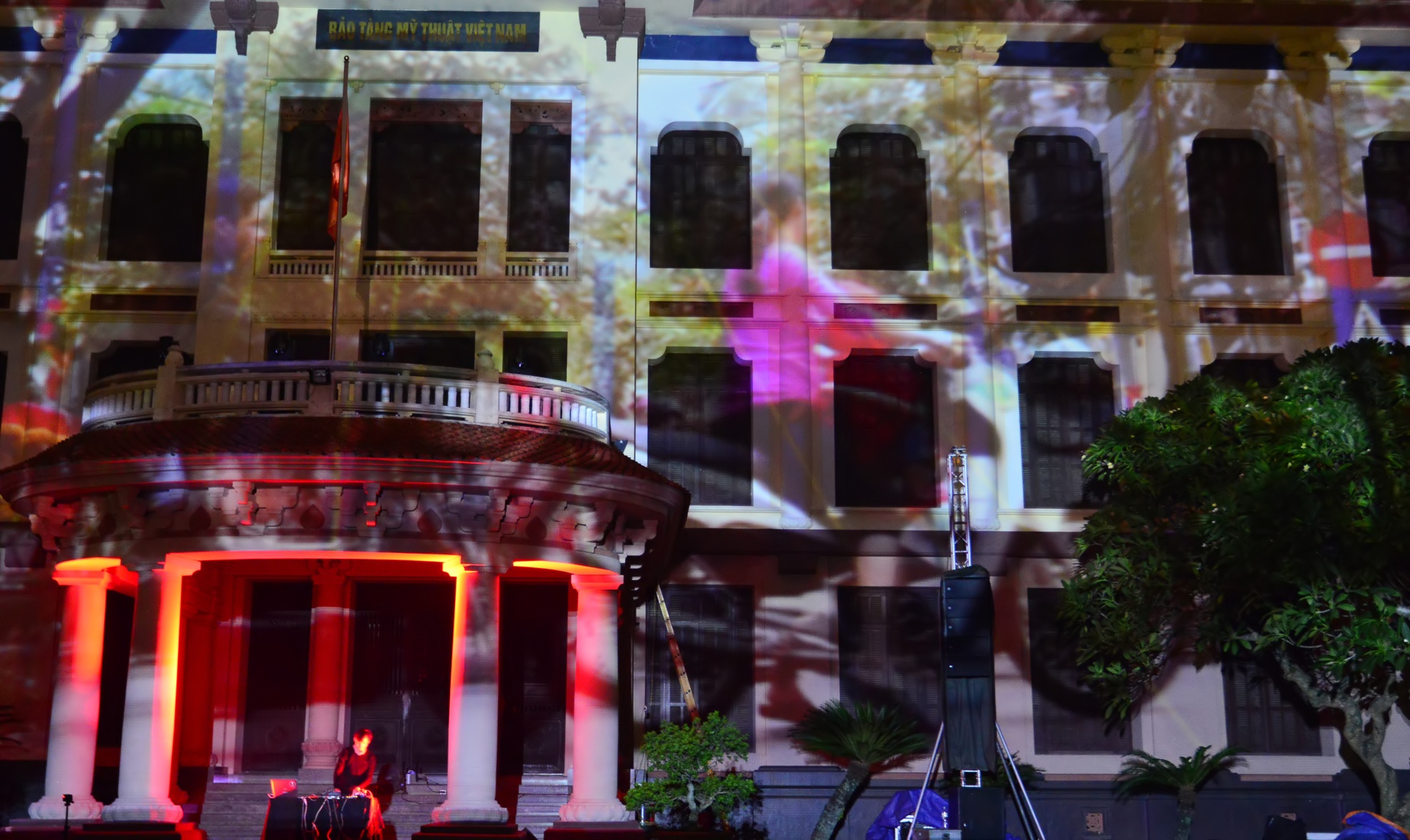 Mặt tiền Bảo tàng Mỹ thuật tối 14/11 trở thành nền cho những bức tranh ánh sáng khổng lồ, thể hiện sự giao lưu văn hóa Việt - Đức.