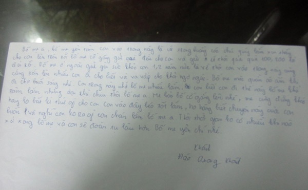 Dòng chữ không được mấy nắn nót, bị can 17 tuổi bị khởi tố tội Xâm phạm thi thể, mồ mả, hài cốt và Trộm cắp tài sản chia sẻ ở trong trại tạm giam viết rằng nhớ bố mẹ nhiều. "Con biết con đi thế này bố mẹ khổ tâm nhiều nhưng dại thì phải chịu thôi. Mẹ bảo bố cố gắng lên nhé...", Khánh viết.