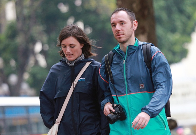 | Nhiều du khách nước ngoài mặc áo chống gió đi dạo trên phố. |