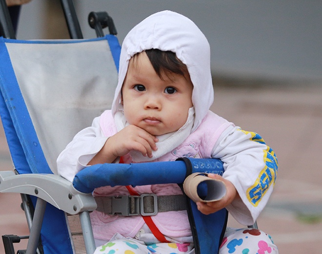| Em bé được bố mẹ đội thêm chiếc mũ khi ra công viên. |