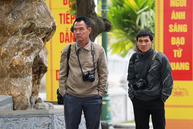 | Giá lạnh cũng làm cho các khu di tích lịch sử vắng vẻ. Các thợ ảnh đứng ở cổng chùa Trấn Quốc co ro. |