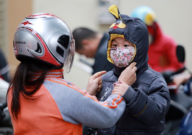 | Còn một em nhỏ khác được bố mẹ mặc kín tránh gió trước khi đến trường. |