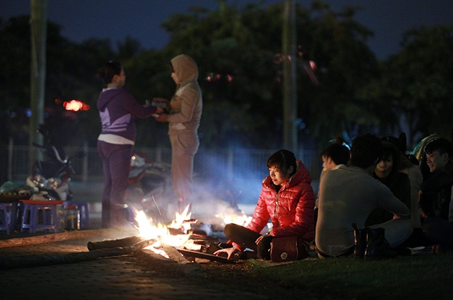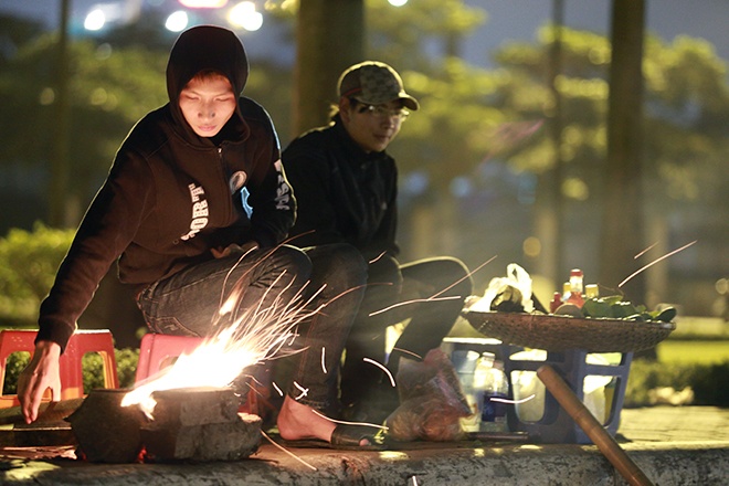 | Nhiệt độ tối 27/11 xuống đến 14 độ C, nhiều hàng quán ven đường ở quảng trường Mỹ Đình đốt lửa sưởi ấm. |