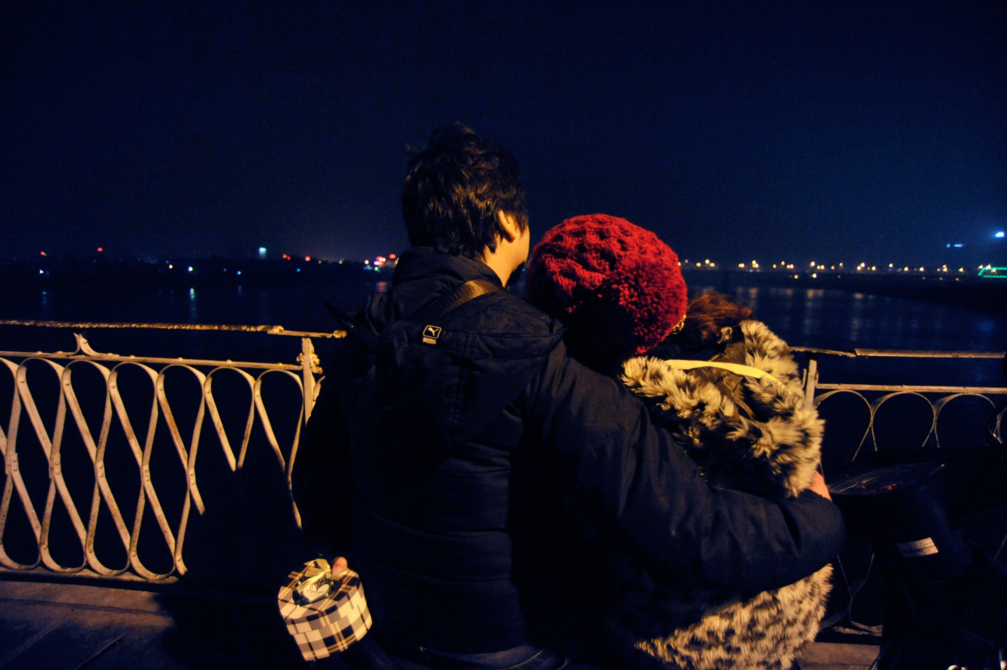 Dưới cái lạnh 10 độ C, trong khi nhiều người dân ở thủ đô phải thu lu trong chăn trên vỉa hè hoặc đốt lửa sưởi ấm thì có cặp tình nhân vẫn ngồi trên cầu Long Biên tâm sự.