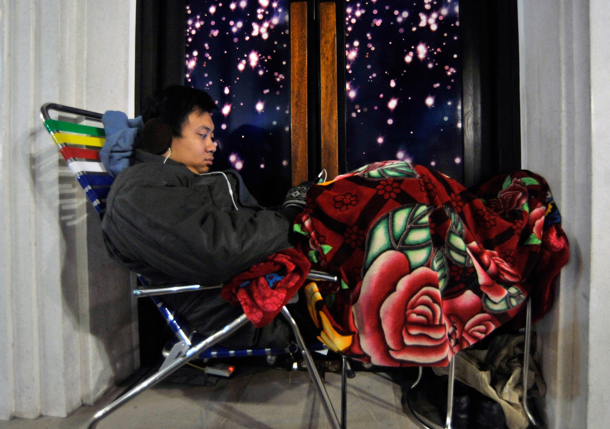 | Ông Bình (người Thái Nguyên) tranh thủ chợp mắt ở một cửa hàng đồng hồ trên phố Hàng Khay. Ông nhận ca trực từ 18h đến 6h sáng ngày hôm sau và phải ngủ bên ngoài.