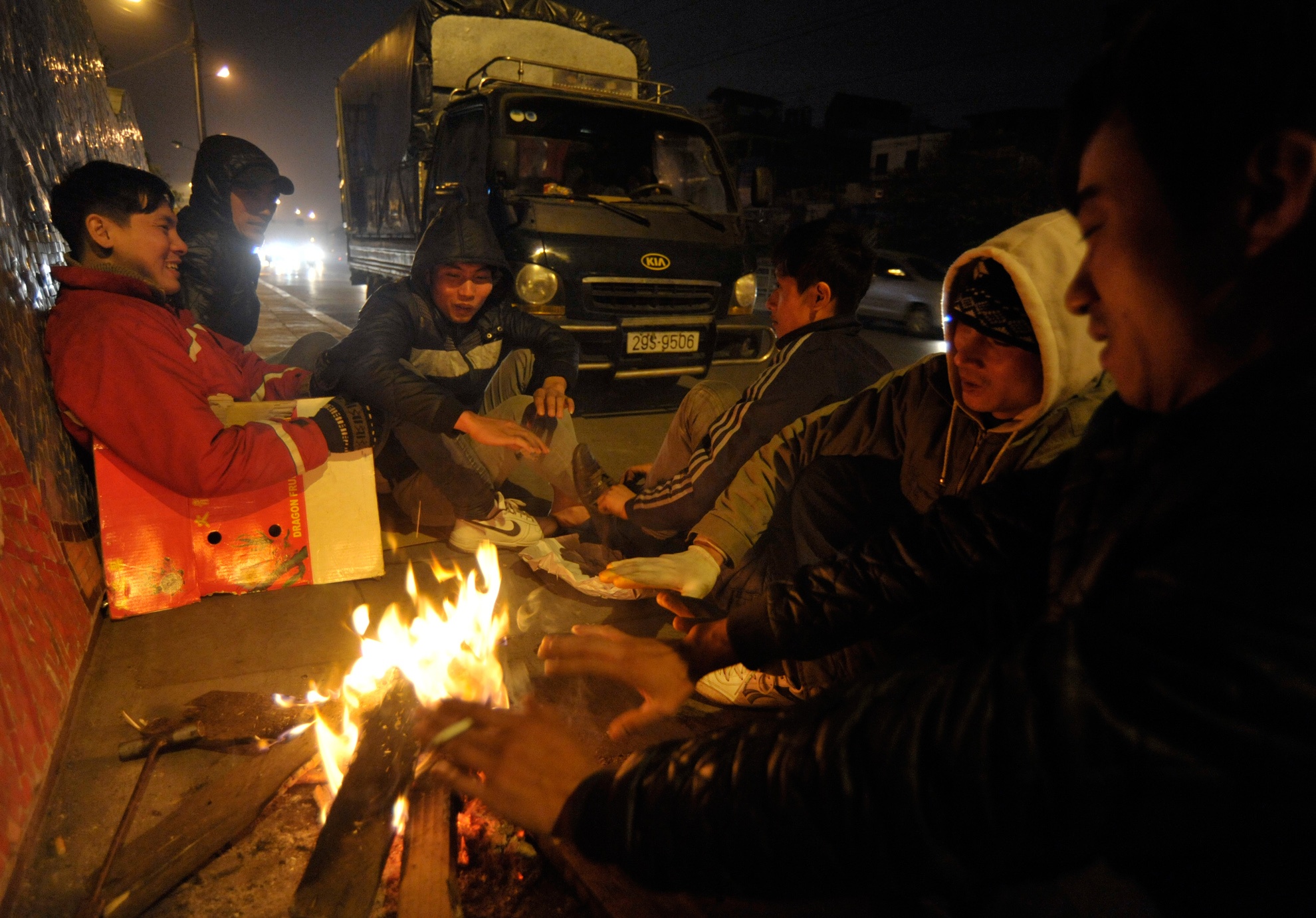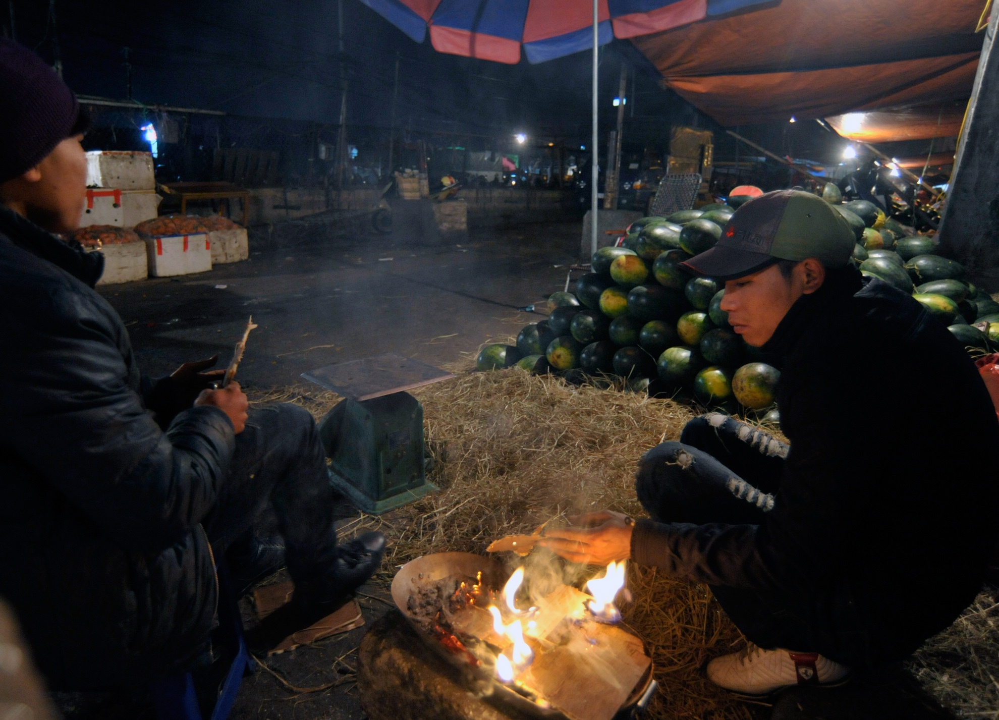 | Anh Trí người Thái Nguyên cùng các anh em trong tổ bốc xếp hoa quả ở chợ Long Biên ngồi sưởi ấm. Do ngày hôm sau là rằm tháng giêng nên lượng hàng đổ về chợ nhiều hơn bình thường, mọi người phải thức thâu đêm.