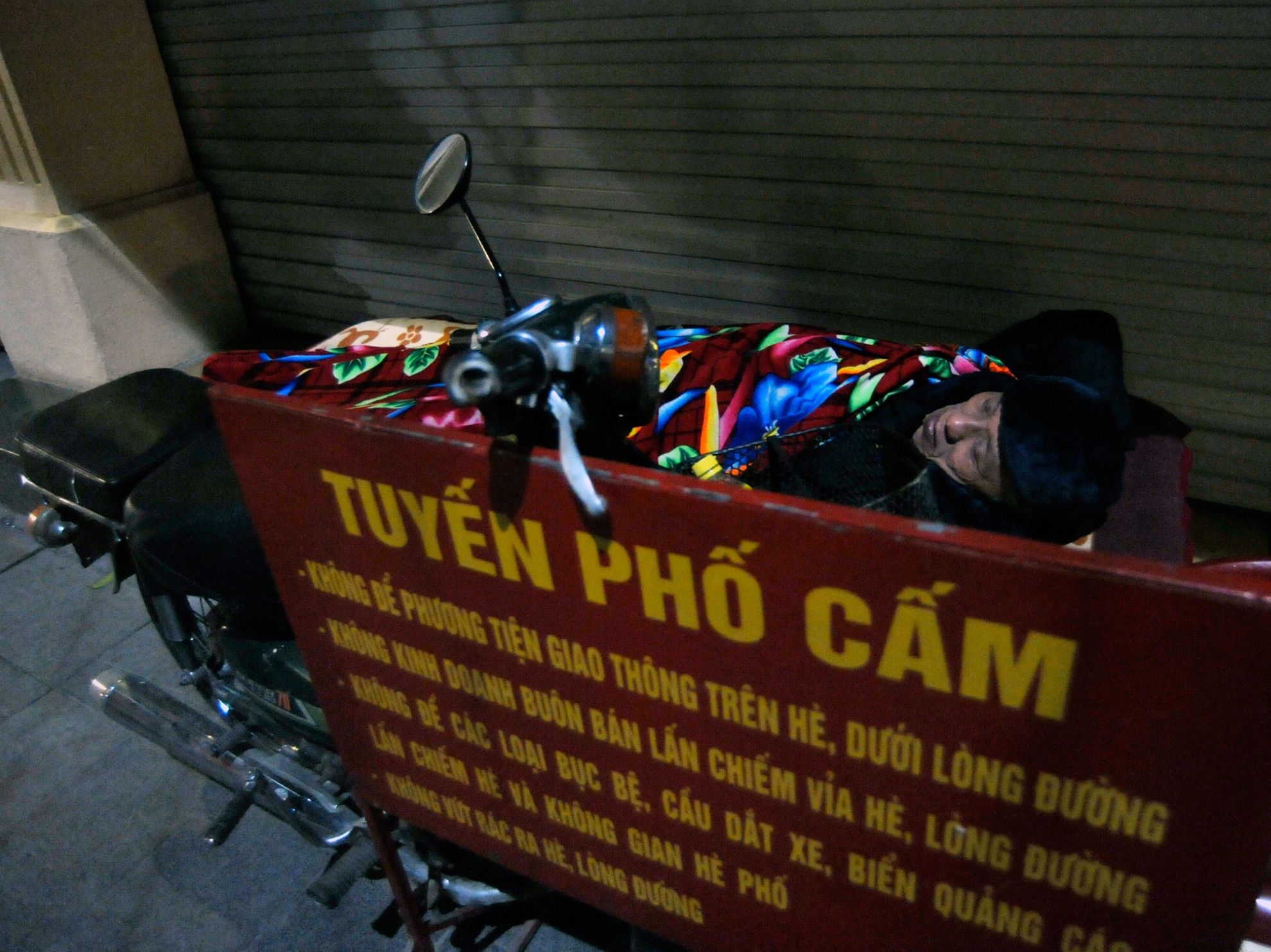 | Người chạy xe ôm đêm khi không có khách và nhân viên bảo vệ một cửa hàng trên phố Trần Nhân Tông ngả ngốn trên vỉa hè tâm sự.