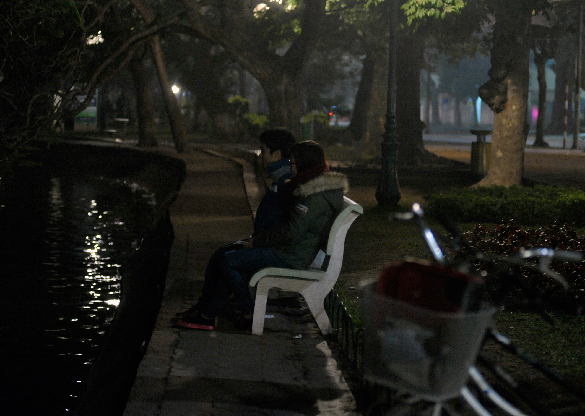 | Giá rét, nhiều người ngại ra đường. Tuy nhiên vẫn có những đôi bạn trẻ quên cả lạnh lẽo vẫn ra hồ Gươm ngồi tâm sự. Trong ảnh là hai sinh viên người Thái Bình ngồi ghế đá lúc nửa đêm.