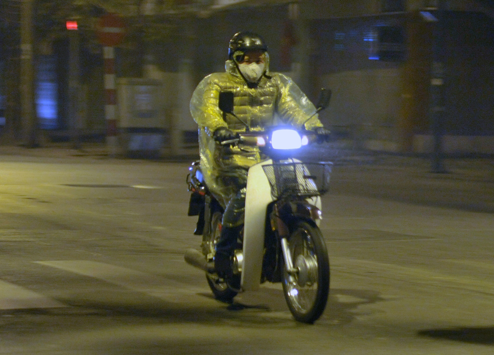 | Đêm qua, Hà Nội lạnh buốt, đường phố vắng vẻ, chỉ có âm thanh lĩnh lặng và tiếng gió phần phật từ chiếc áo mưa mỏng của người đi xe máy. |